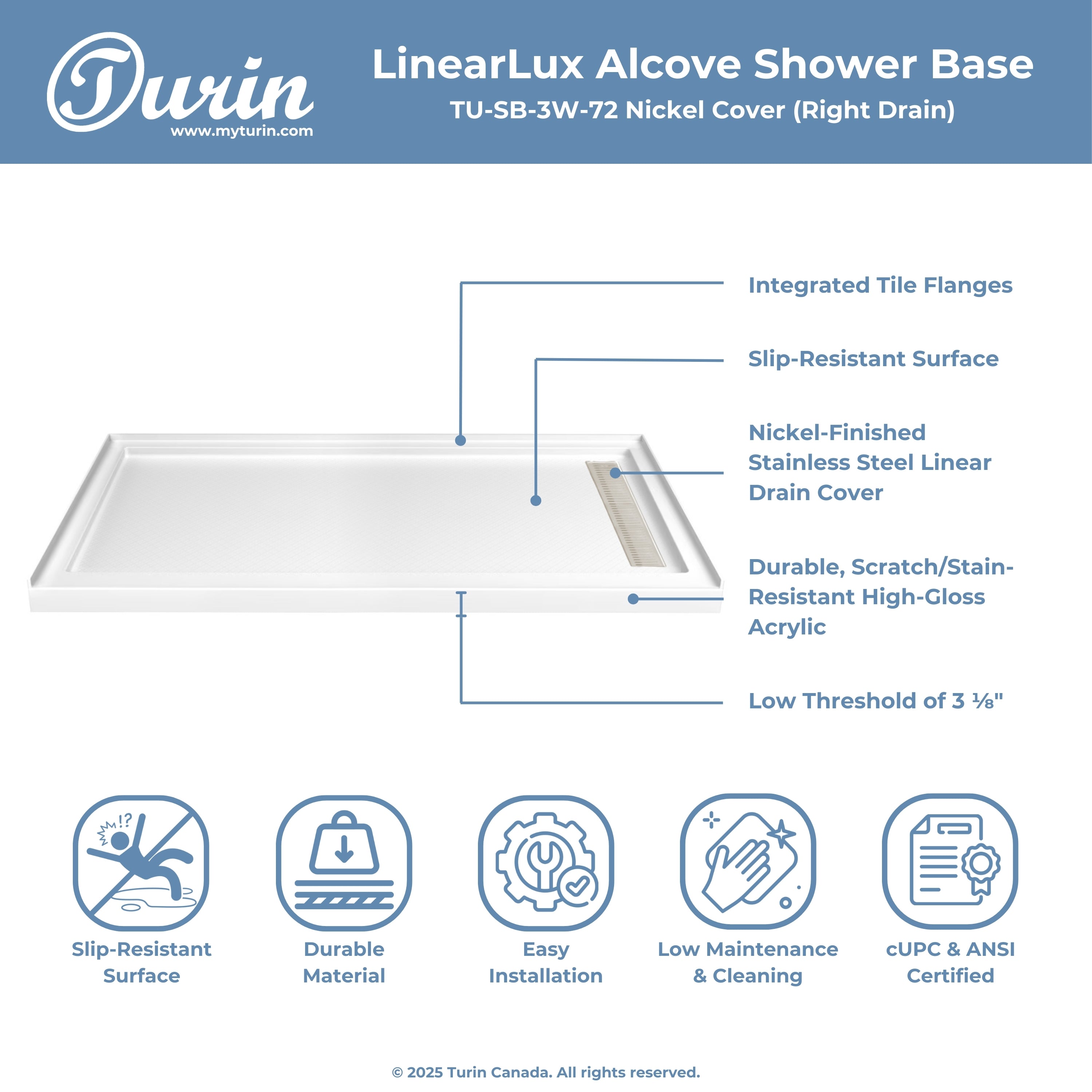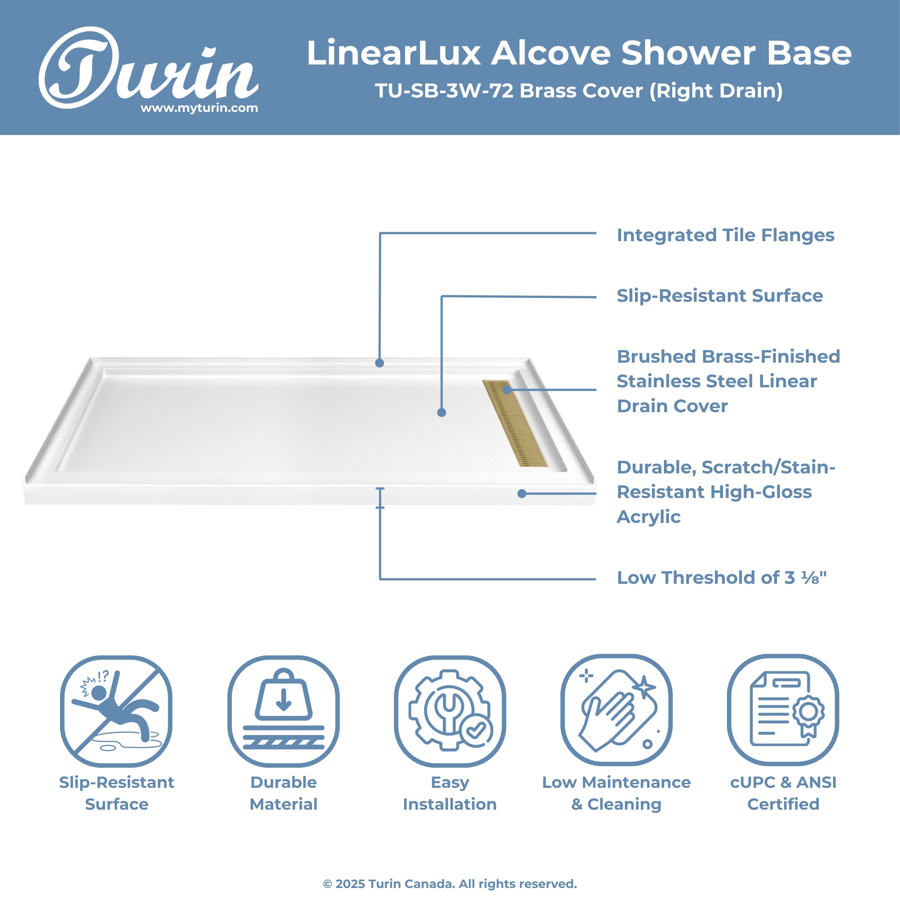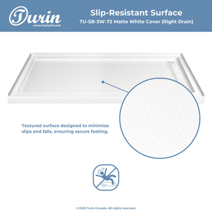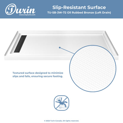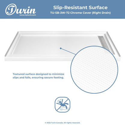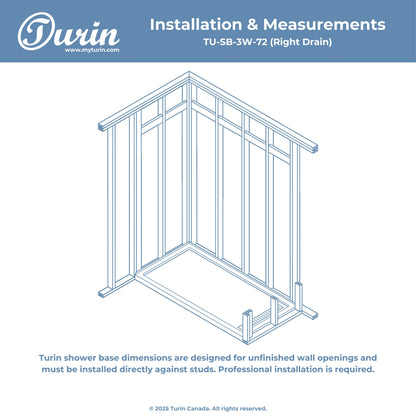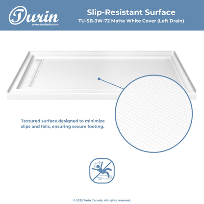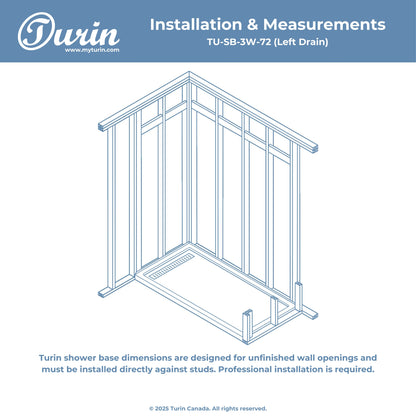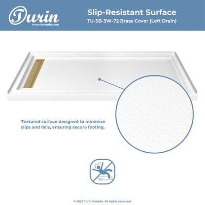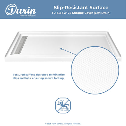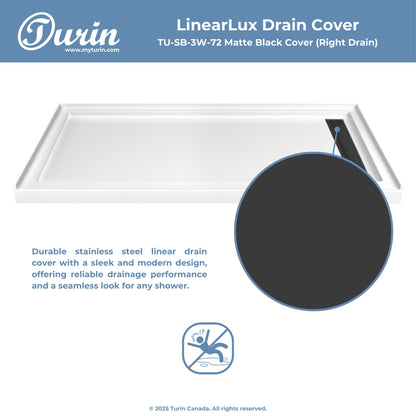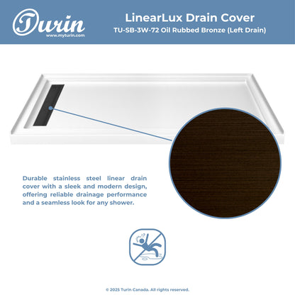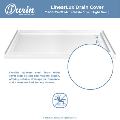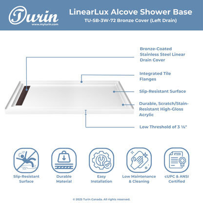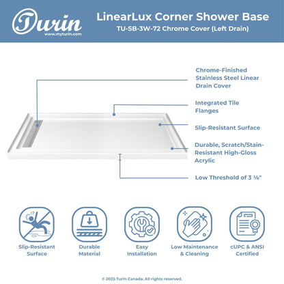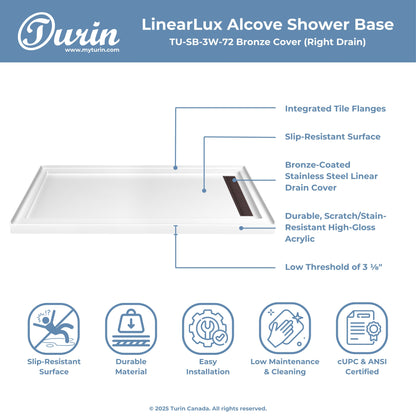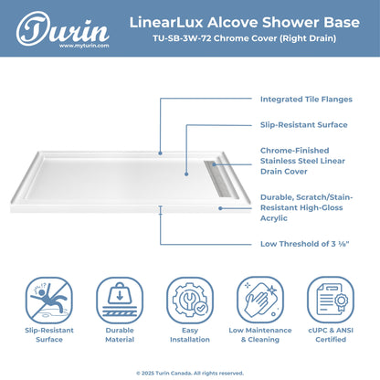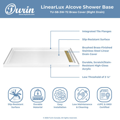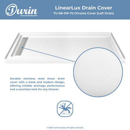 The Turin LinearLux Alcove Shower Base is designed for larger bathrooms, offering an expansive 72" size combined with a sleek, modern appearance. Featuring a stainless steel linear drain cover available in multiple finishes, this model elevates your bathroom's style. Integrated tile flanges, positioned against surrounding walls, ensure leak-proof tiling and simplify installation. The slip-resistant surface prioritizes safety, providing dependable traction for all users. Crafted from high-quality, durable acrylic that resists scratches and stains for lasting performance and beauty.