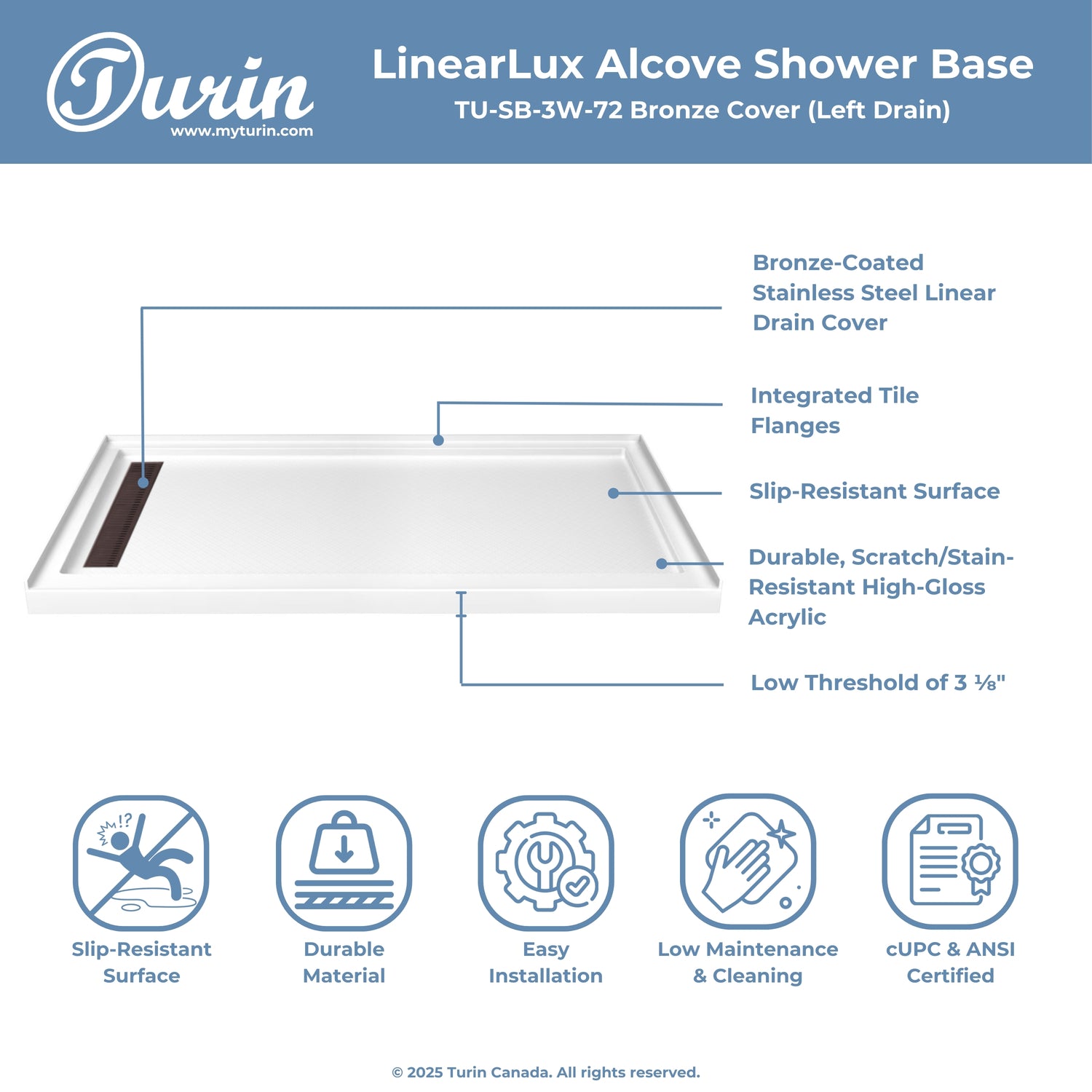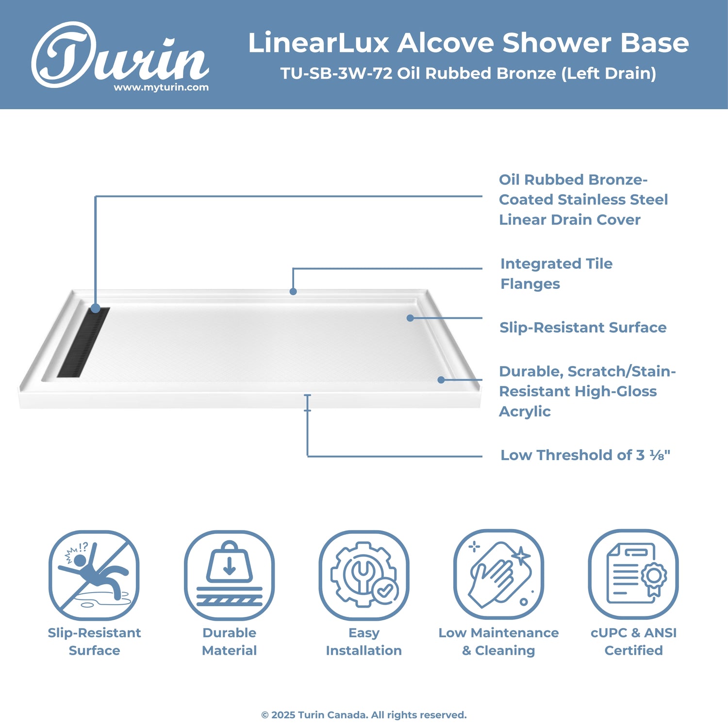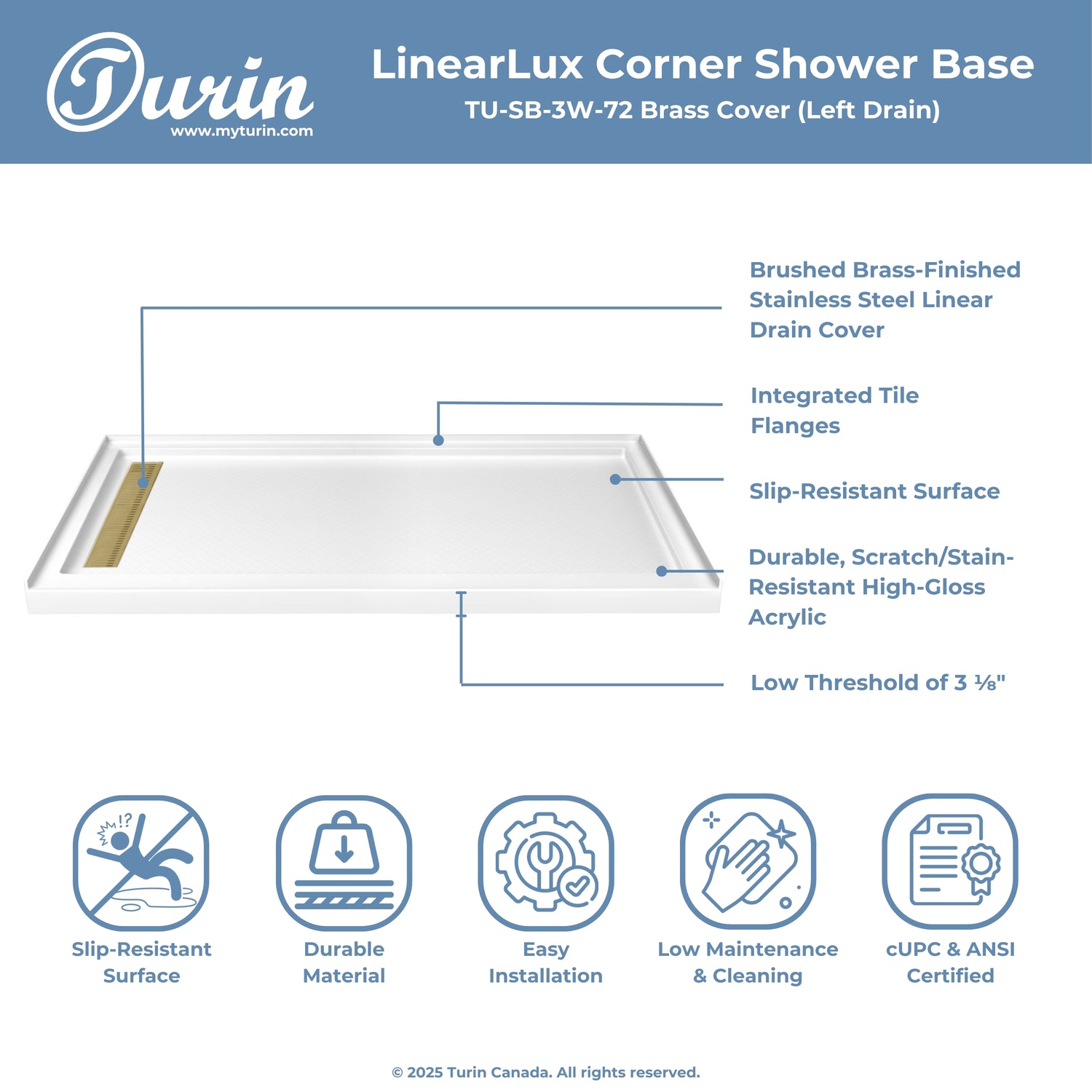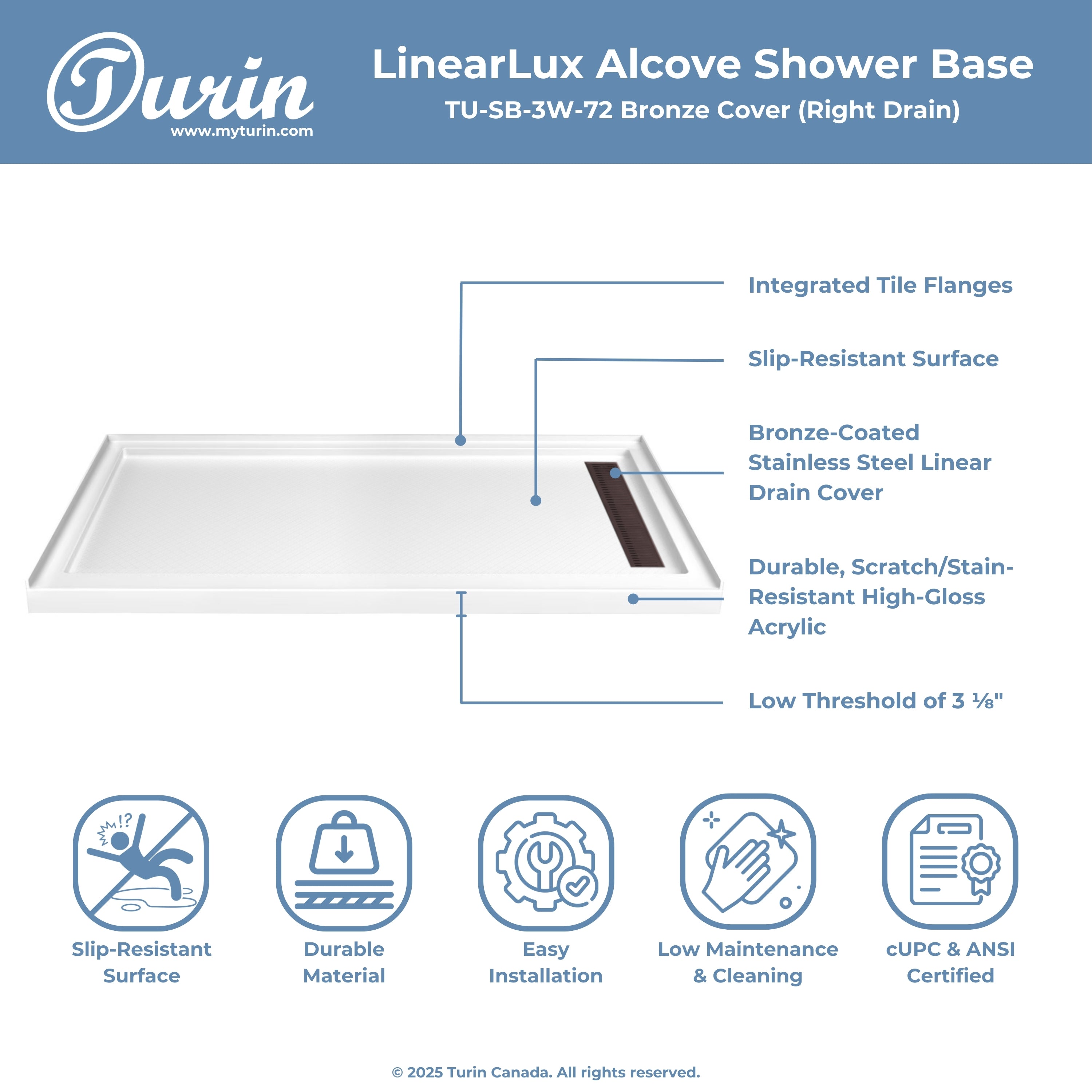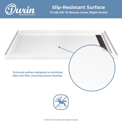 The Turin LinearLux Alcove Shower Base is designed for larger bathrooms, offering an expansive 72" size combined with a sleek, modern appearance. Featuring a stainless steel linear drain cover available in multiple finishes, this model elevates your bathroom's style. Integrated tile flanges, positioned against surrounding walls, ensure leak-proof tiling and simplify installation. The slip-resistant surface prioritizes safety, providing dependable traction for all users. Crafted from high-quality, durable acrylic that resists scratches and stains for lasting performance and beauty.