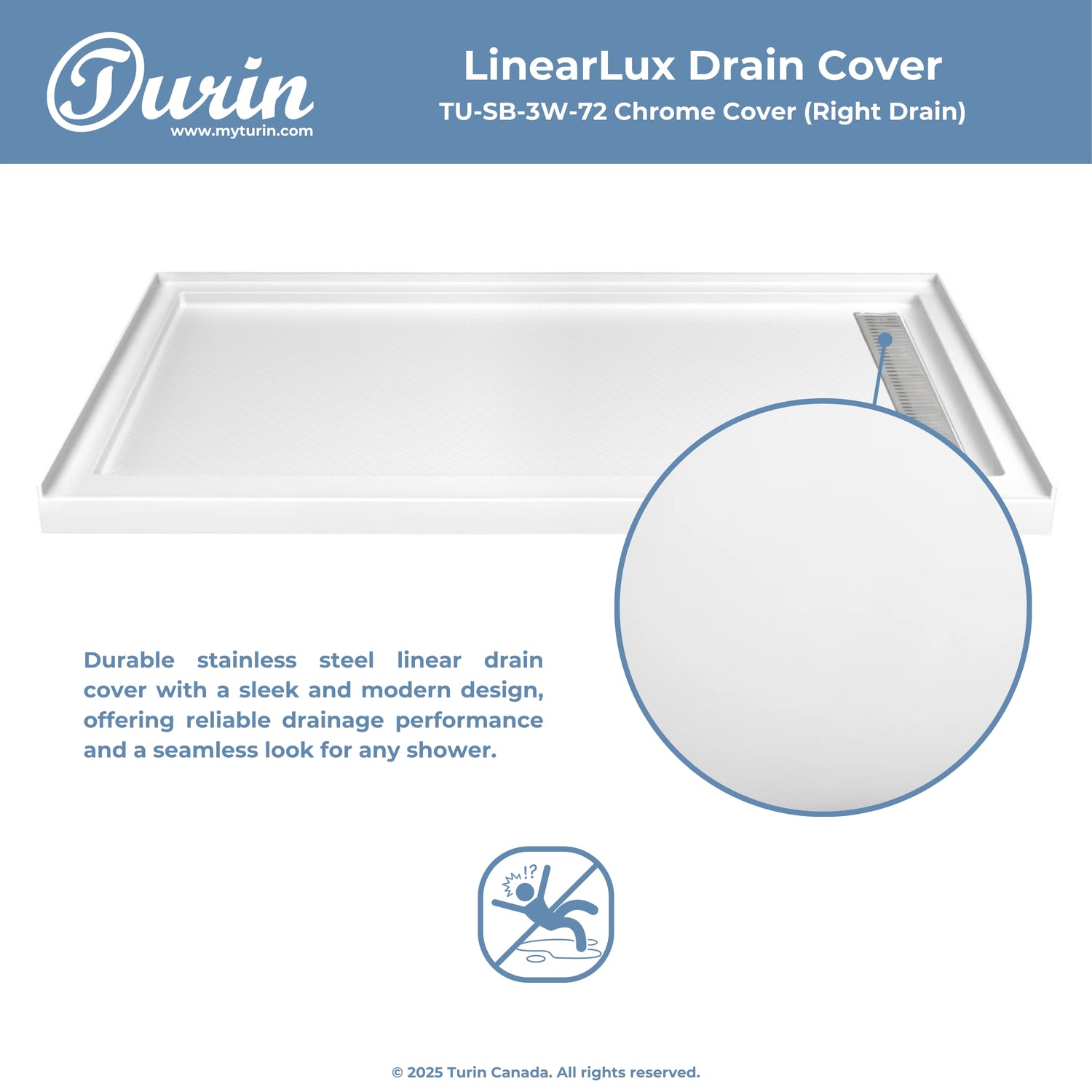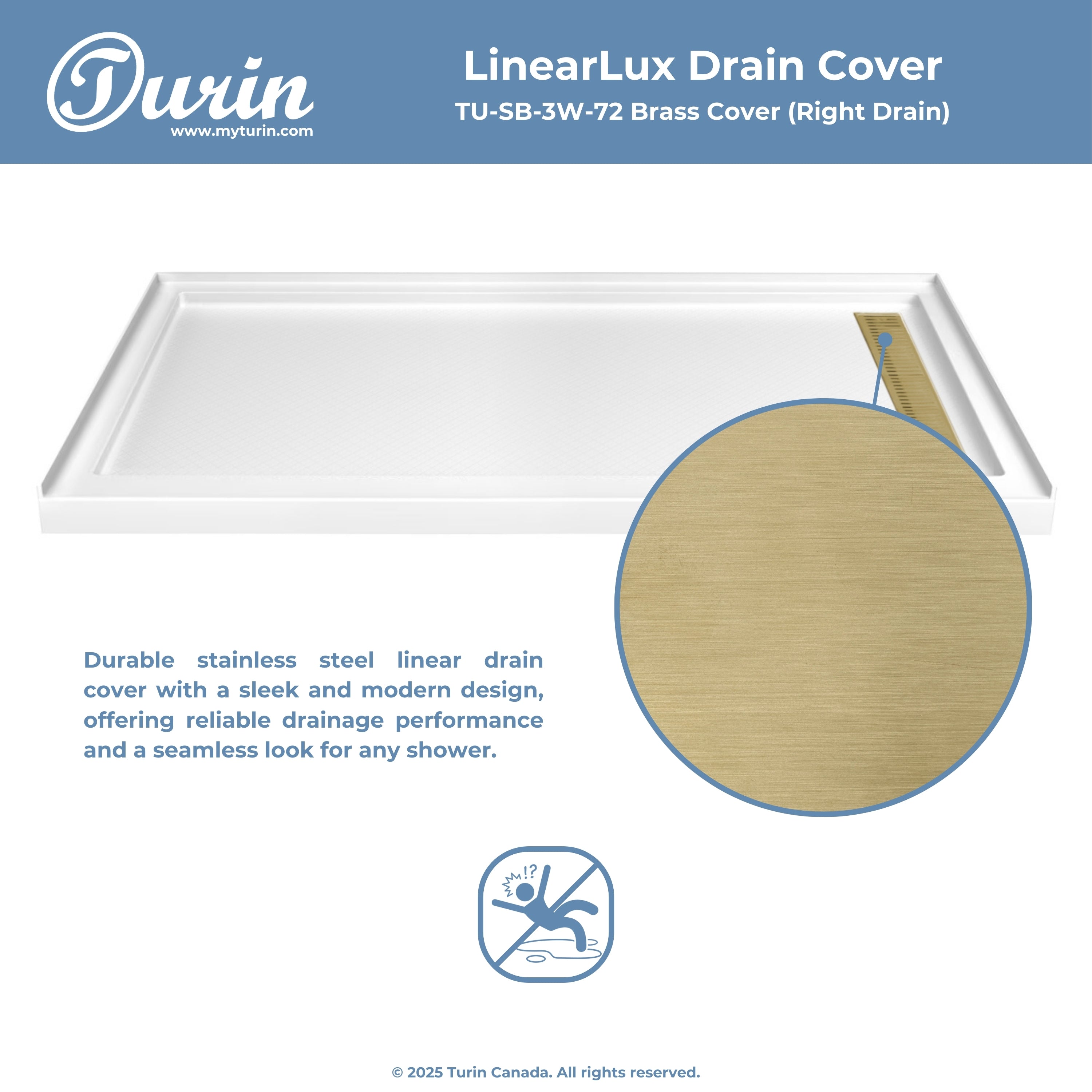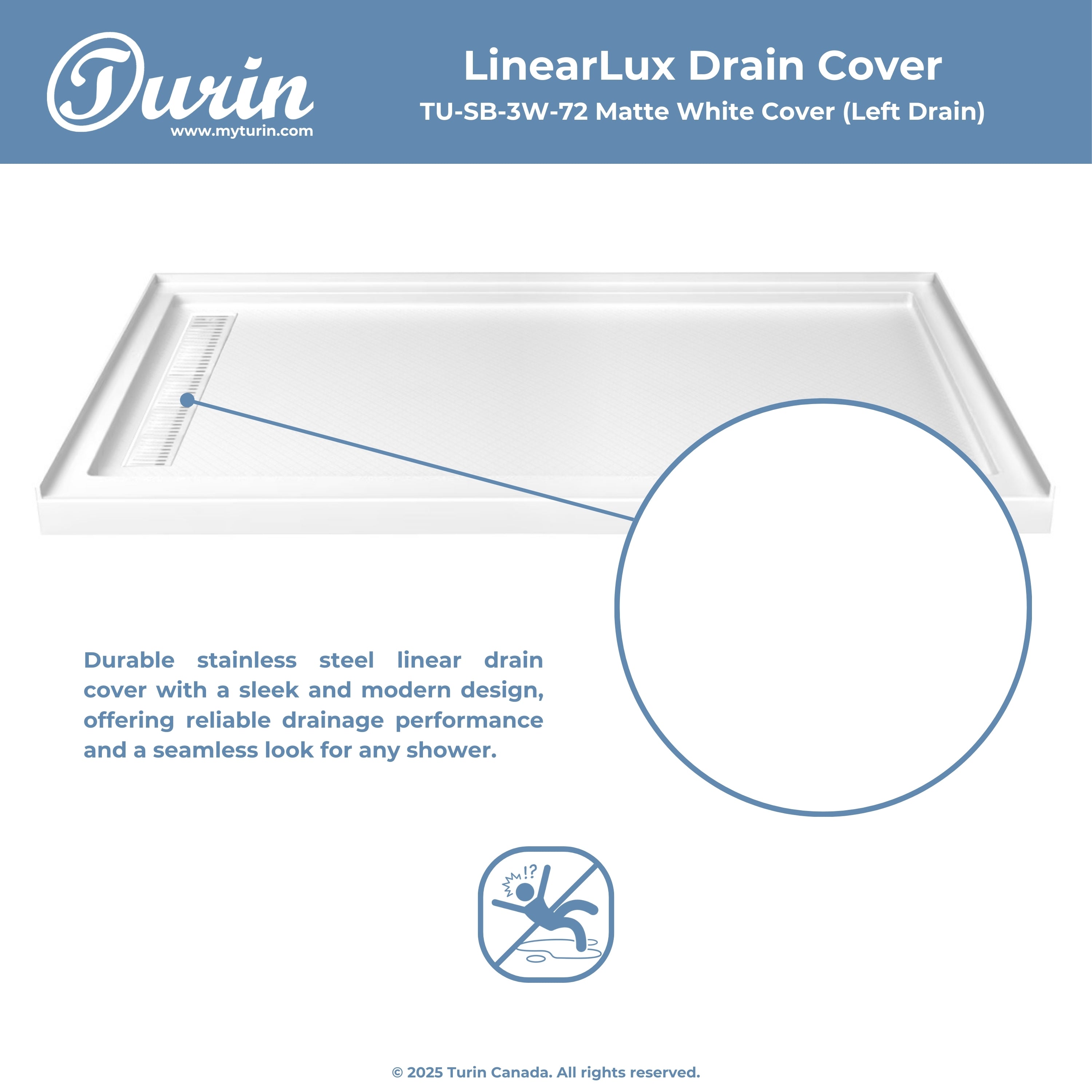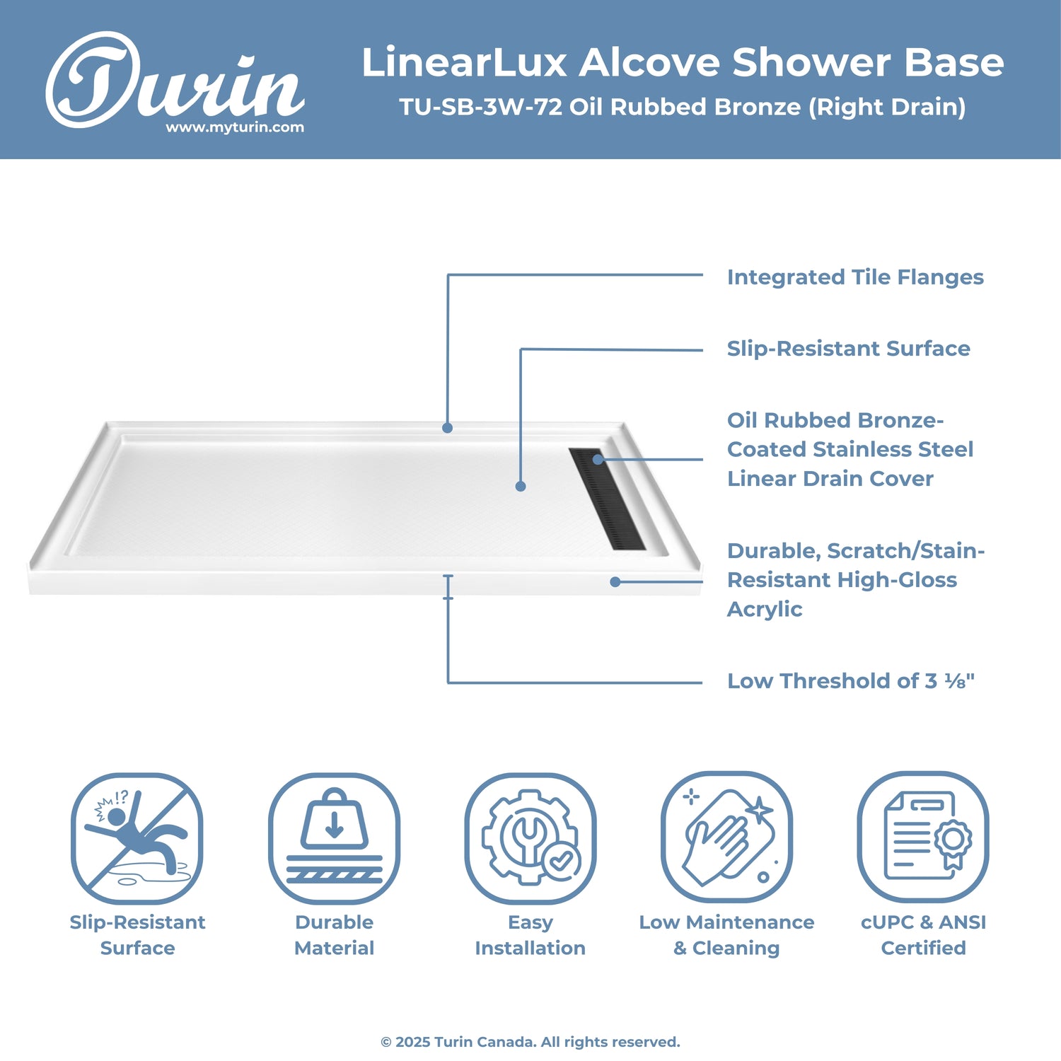 The Turin LinearLux Alcove Shower Base is designed for larger bathrooms, offering an expansive 72" size combined with a sleek, modern appearance. Featuring a stainless steel linear drain cover available in multiple finishes, this model elevates your bathroom's style. Integrated tile flanges, positioned against surrounding walls, ensure leak-proof tiling and simplify installation. The slip-resistant surface prioritizes safety, providing dependable traction for all users. Crafted from high-quality, durable acrylic that resists scratches and stains for lasting performance and beauty.