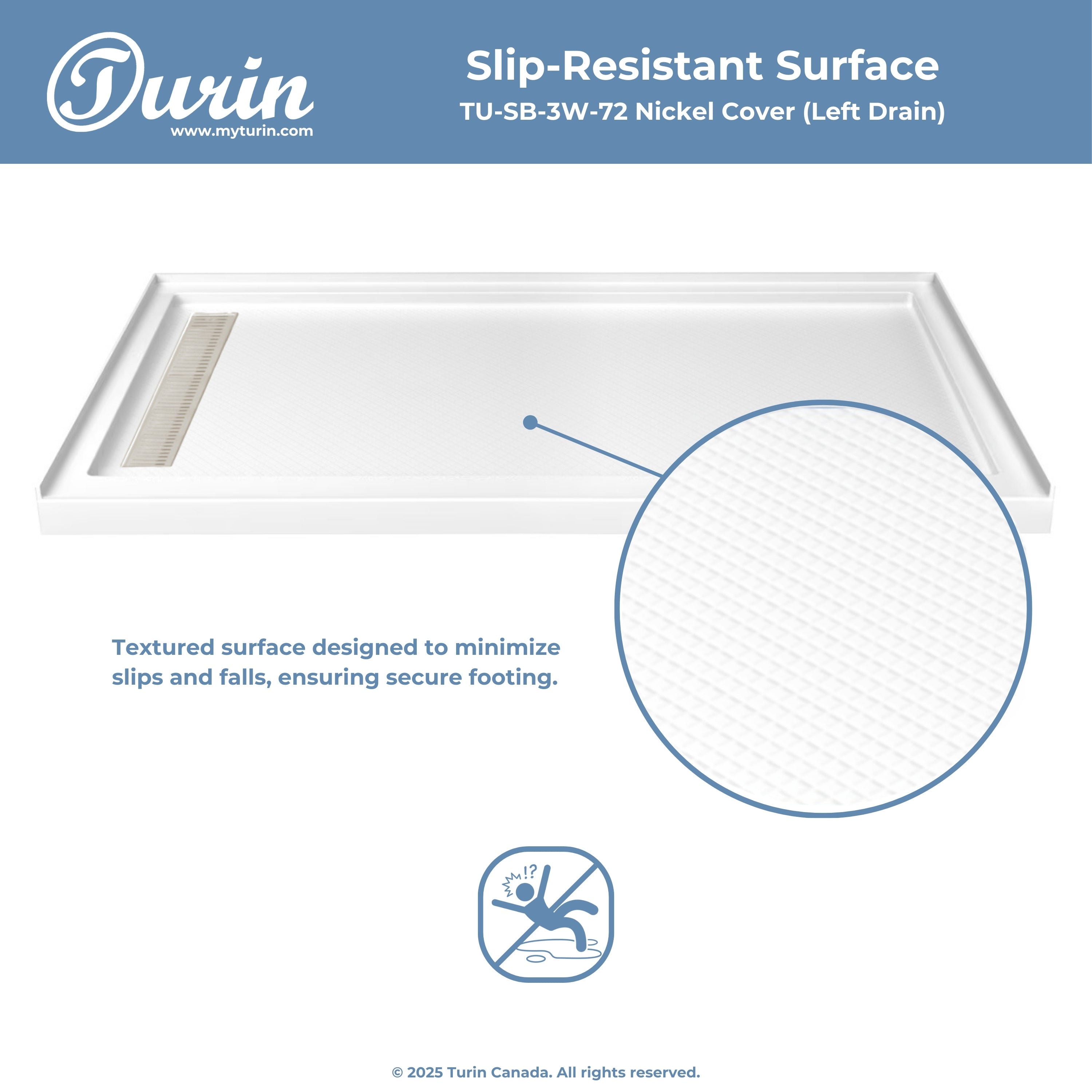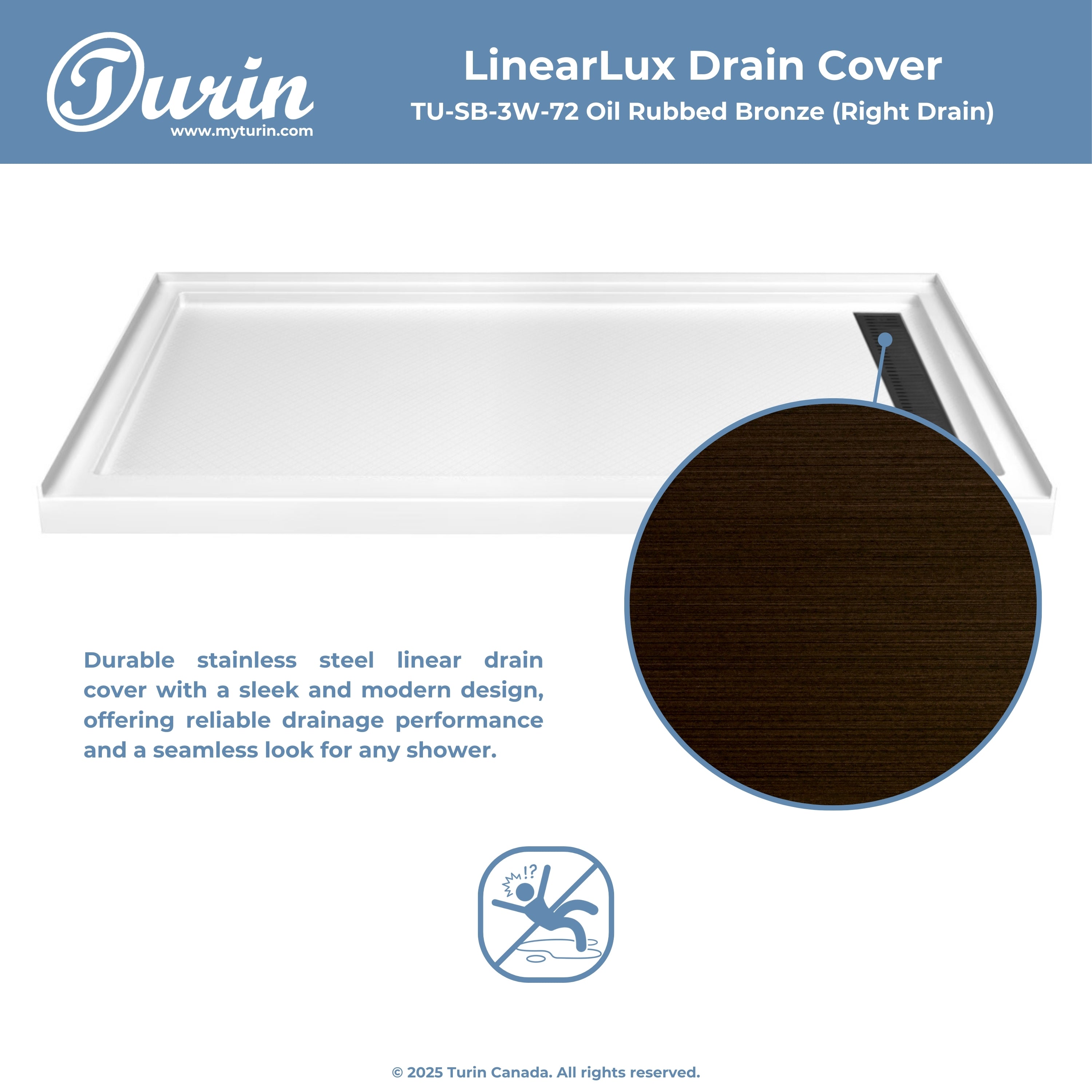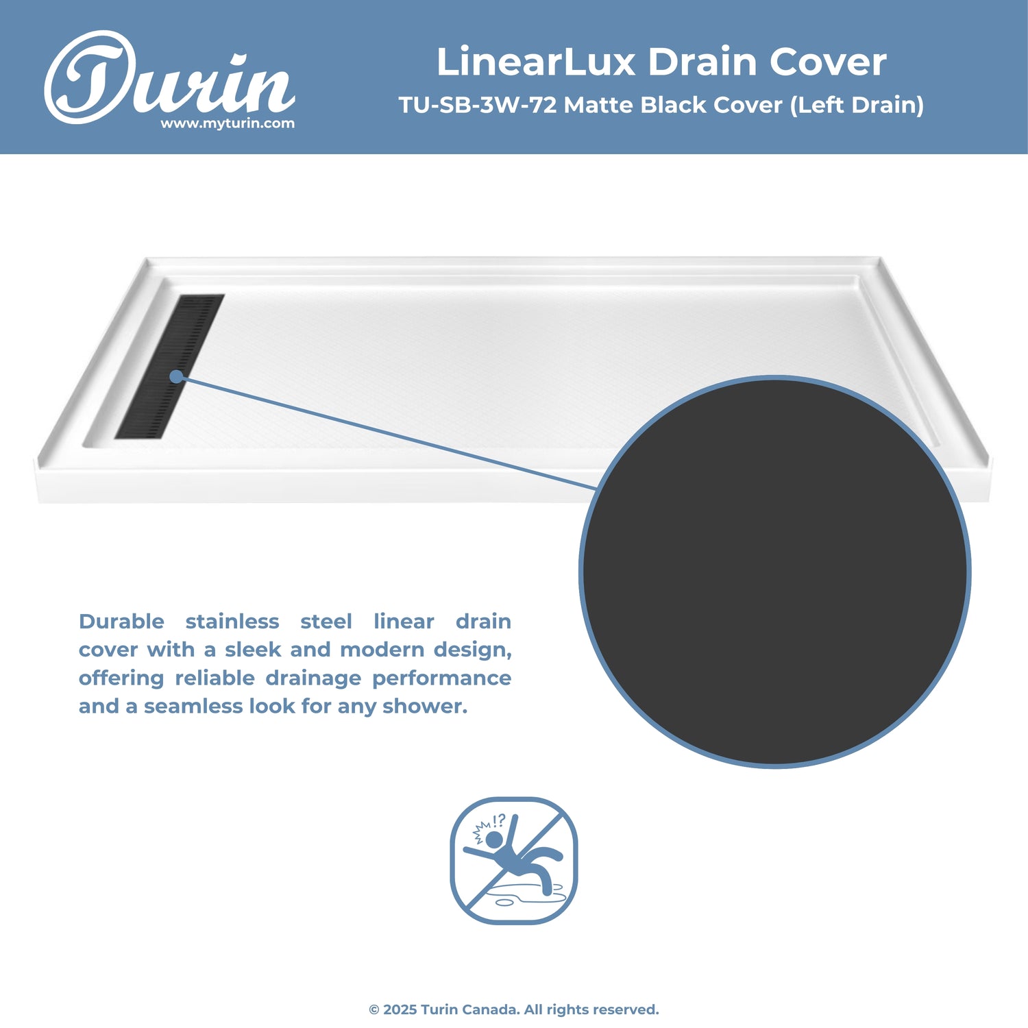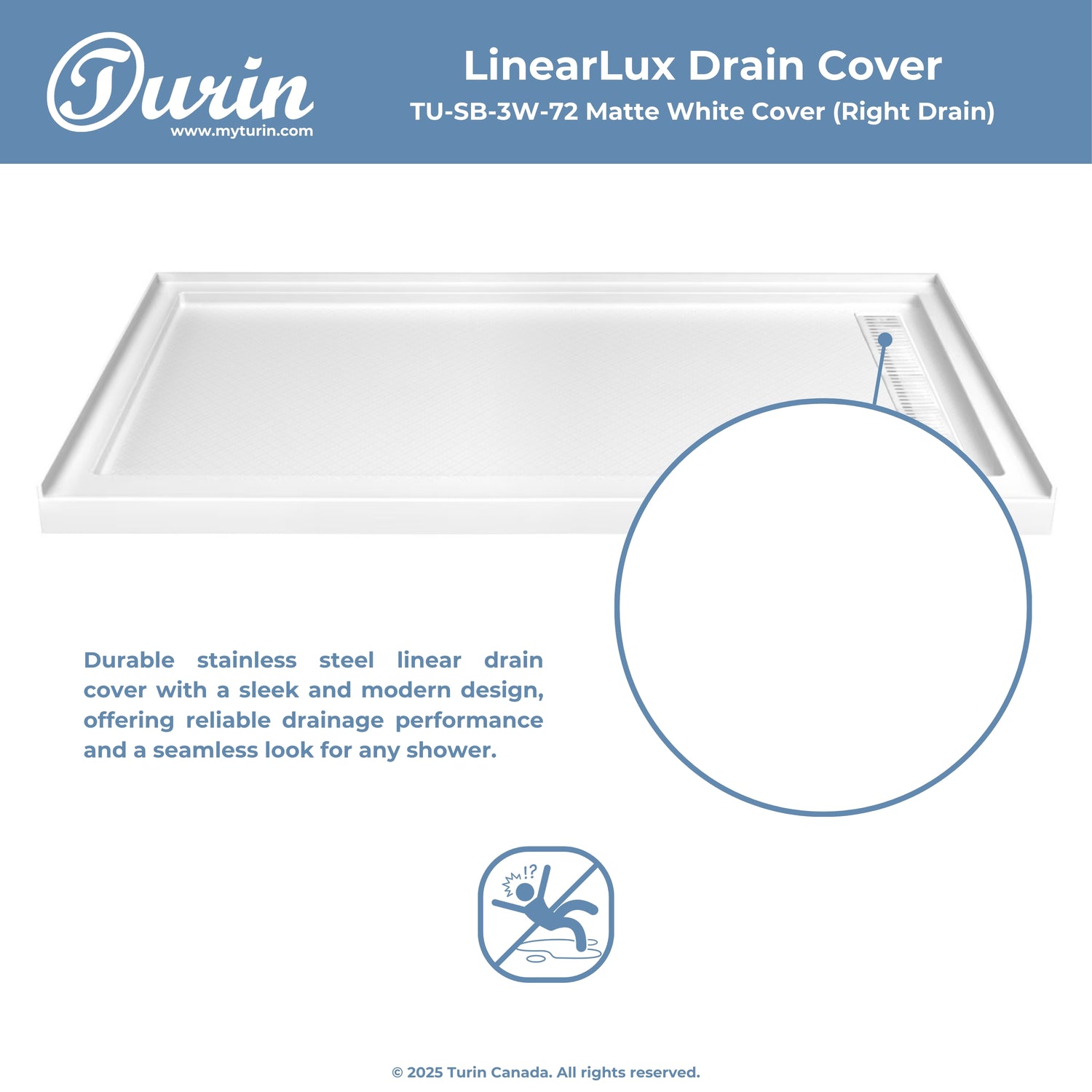 The Turin LinearLux Alcove Shower Base is designed for larger bathrooms, offering an expansive 72" size combined with a sleek, modern appearance. Featuring a stainless steel linear drain cover available in multiple finishes, this model elevates your bathroom's style. Integrated tile flanges, positioned against surrounding walls, ensure leak-proof tiling and simplify installation. The slip-resistant surface prioritizes safety, providing dependable traction for all users. Crafted from high-quality, durable acrylic that resists scratches and stains for lasting performance and beauty.
