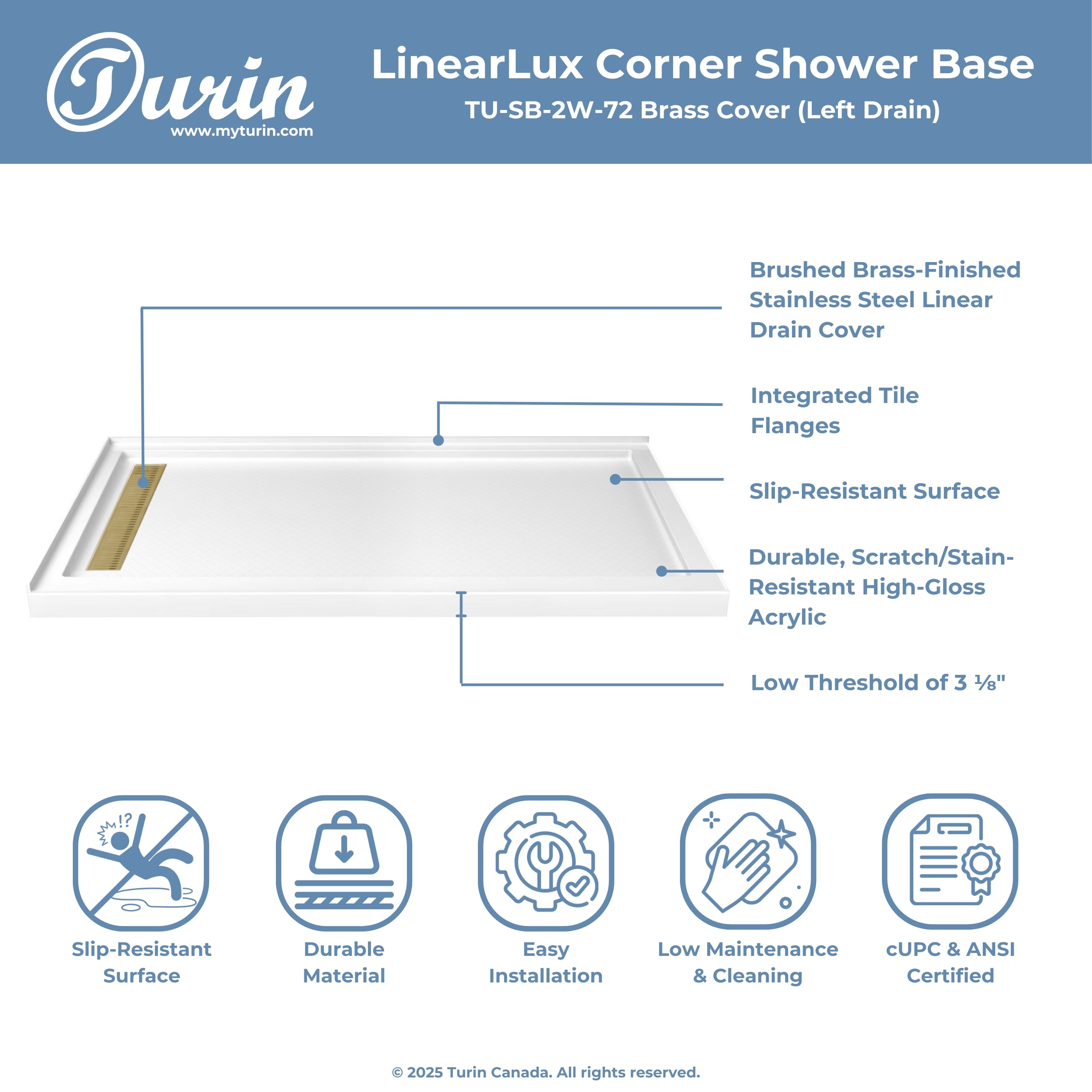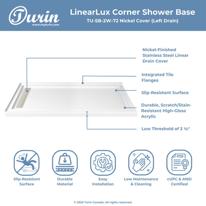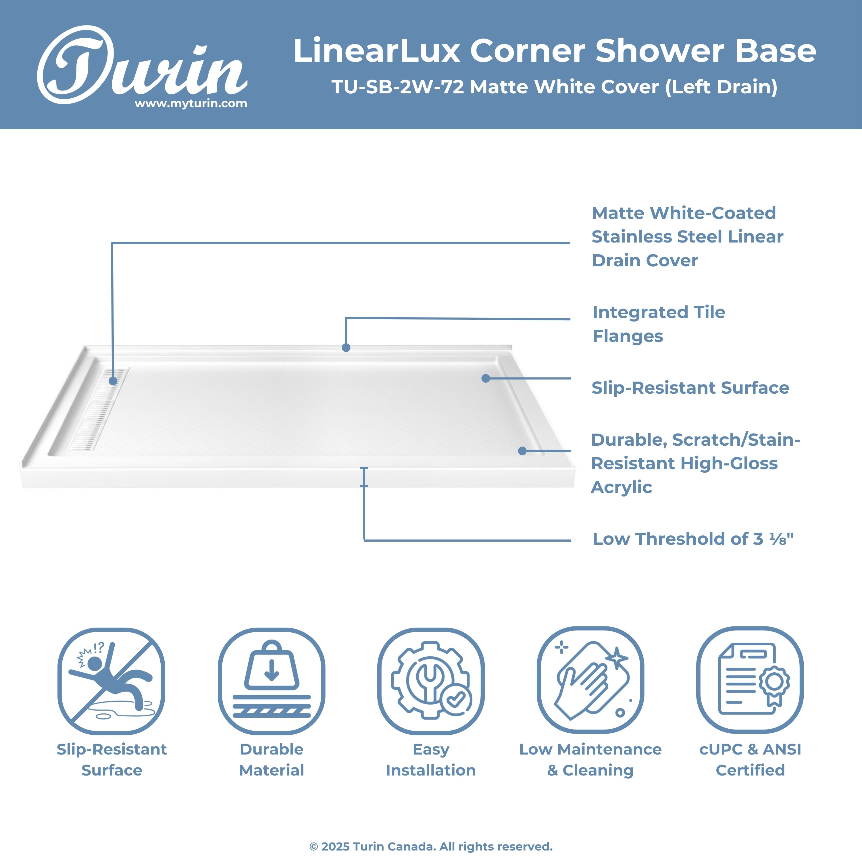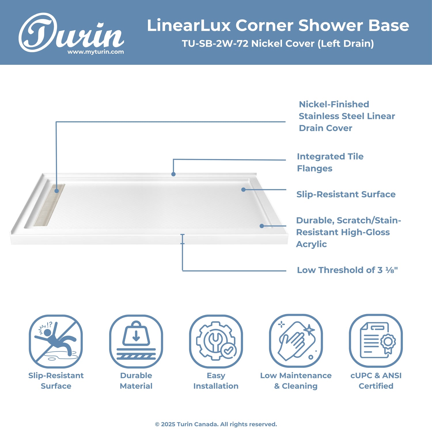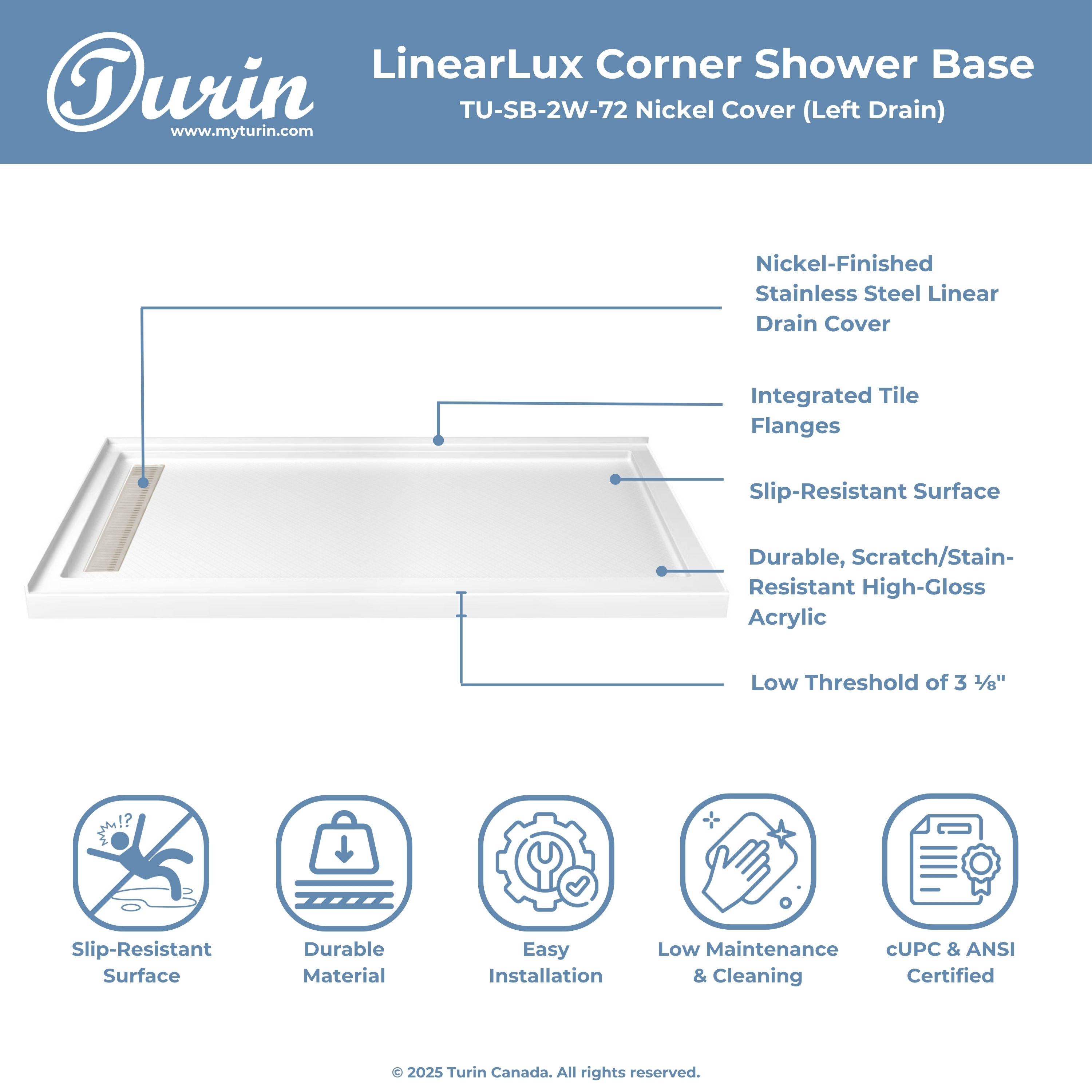 The Turin LinearLux Corner Shower Base offers a spacious 72" corner design, ideal for maximizing bathroom space. Its sleek aesthetics are complemented by a stainless steel linear drain cover, available in a variety of finishes to match your style. Integrated tile flanges, positioned against surrounding walls, ensure leak-proof tiling and simplify installation. The slip-resistant surface prioritizes safety, providing dependable traction for all users. Crafted from high-quality, durable acrylic that resists scratches and stains for lasting performance and beauty.
