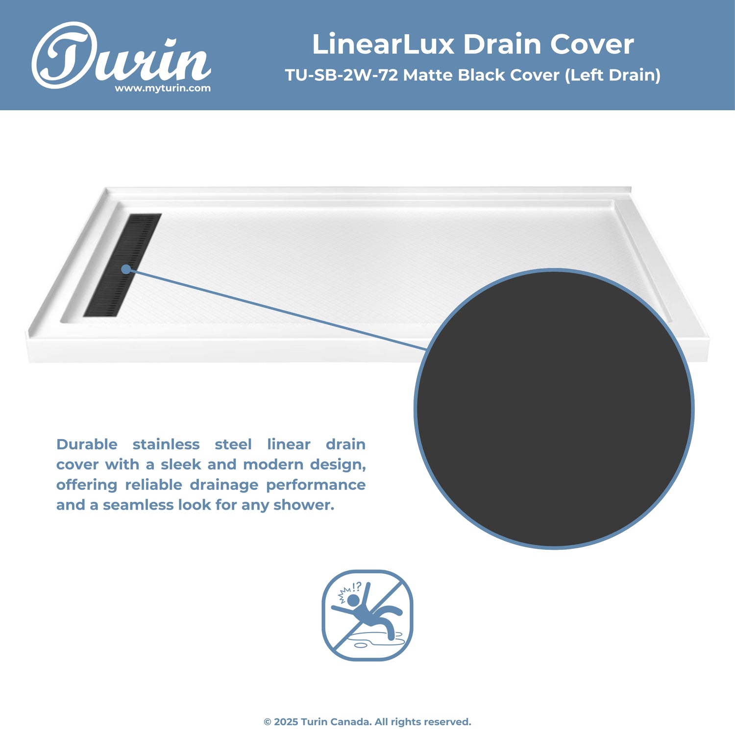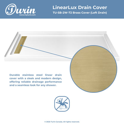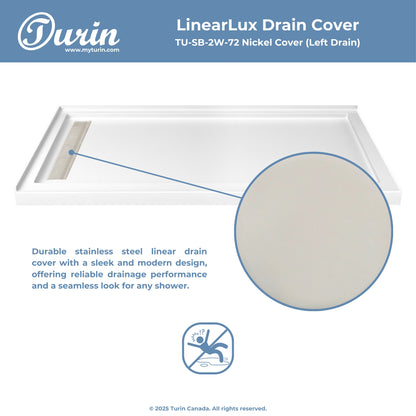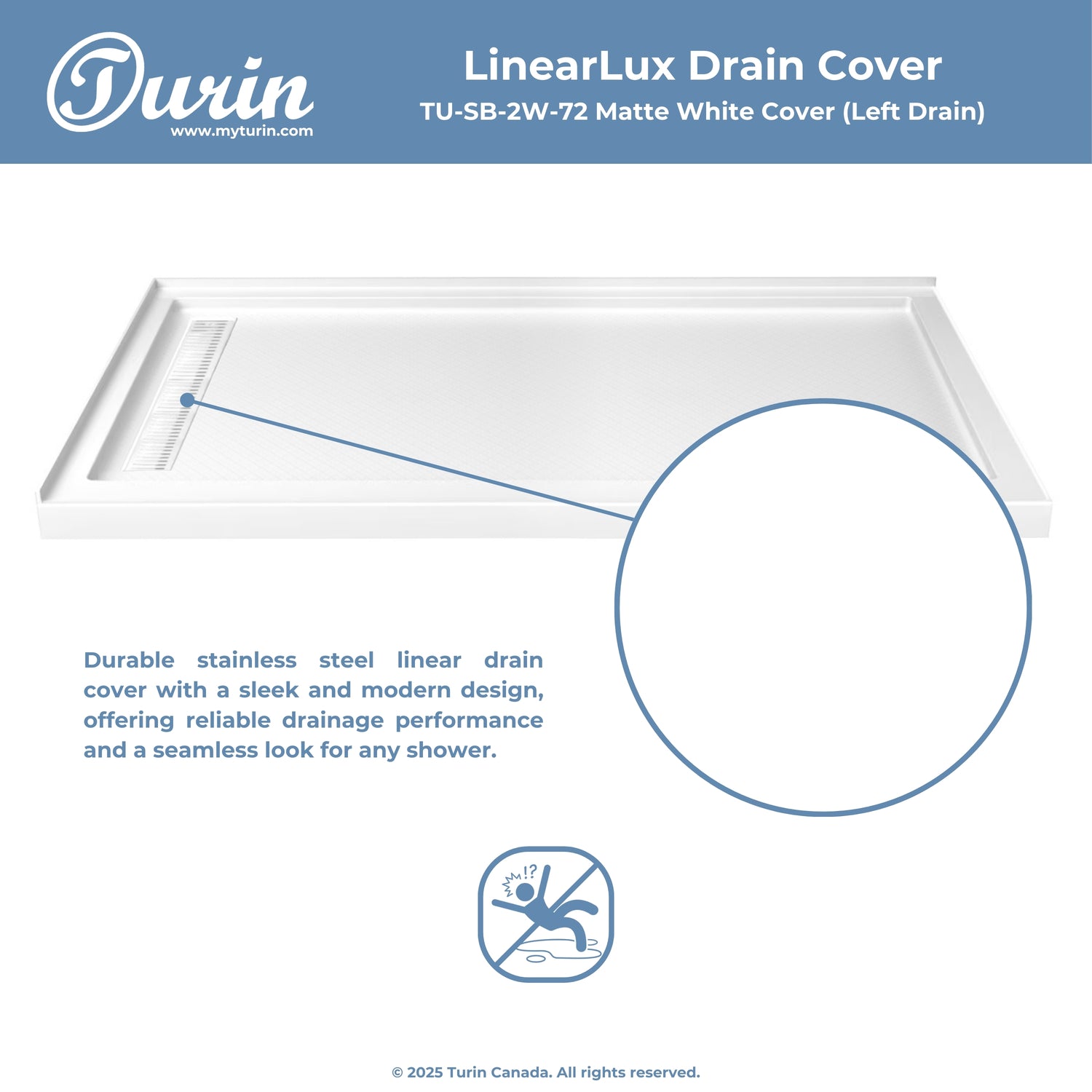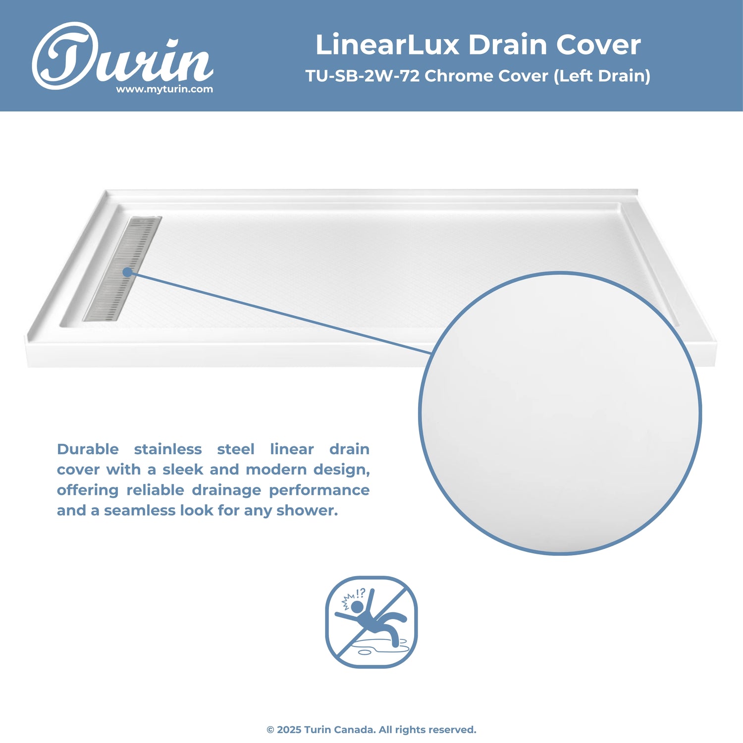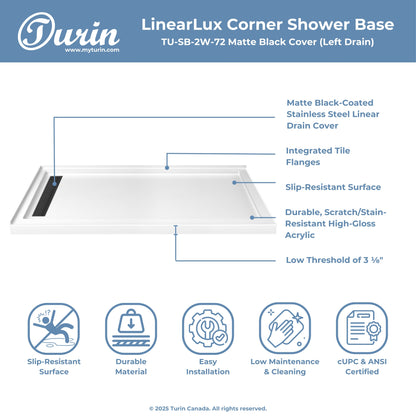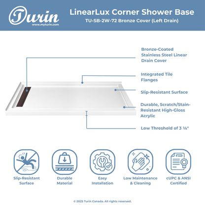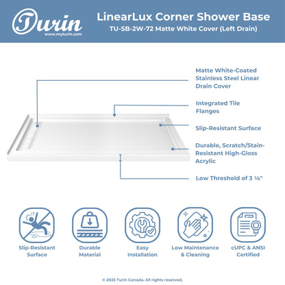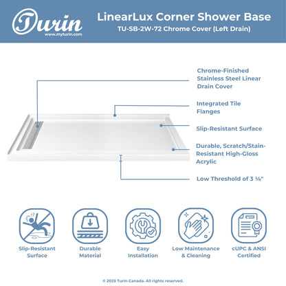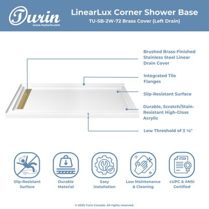 The Turin LinearLux Corner Shower Base offers a spacious 72" corner design, ideal for maximizing bathroom space. Its sleek aesthetics are complemented by a stainless steel linear drain cover, available in a variety of finishes to match your style. Integrated tile flanges, positioned against surrounding walls, ensure leak-proof tiling and simplify installation. The slip-resistant surface prioritizes safety, providing dependable traction for all users. Crafted from high-quality, durable acrylic that resists scratches and stains for lasting performance and beauty.