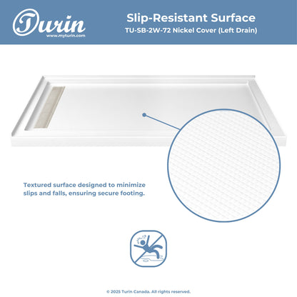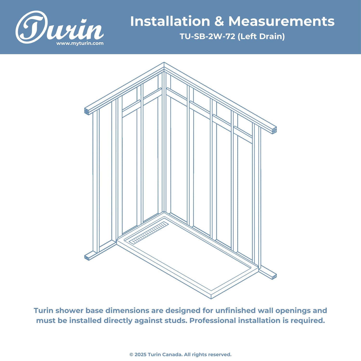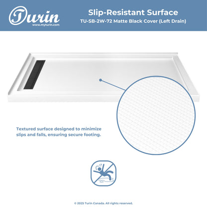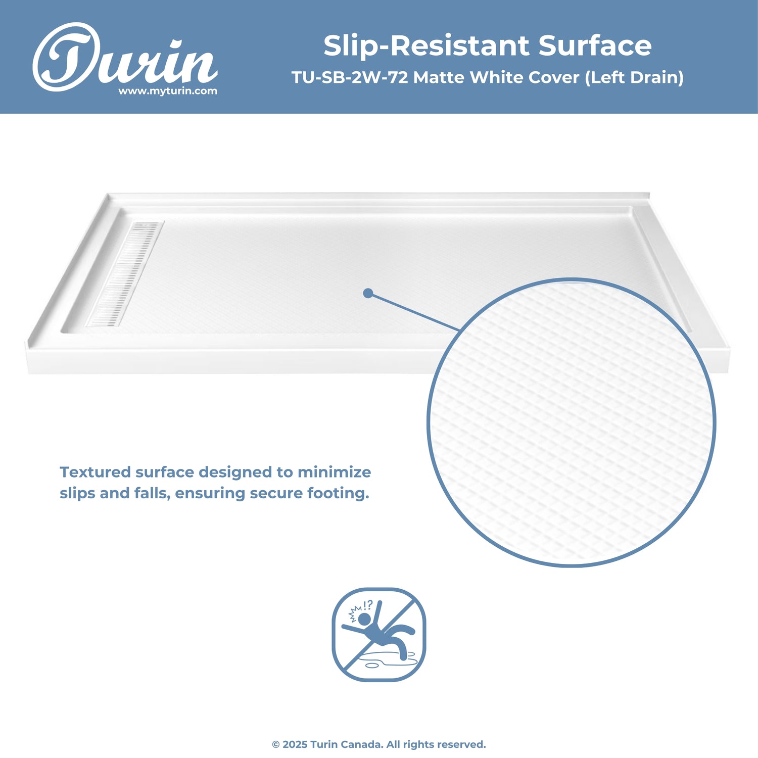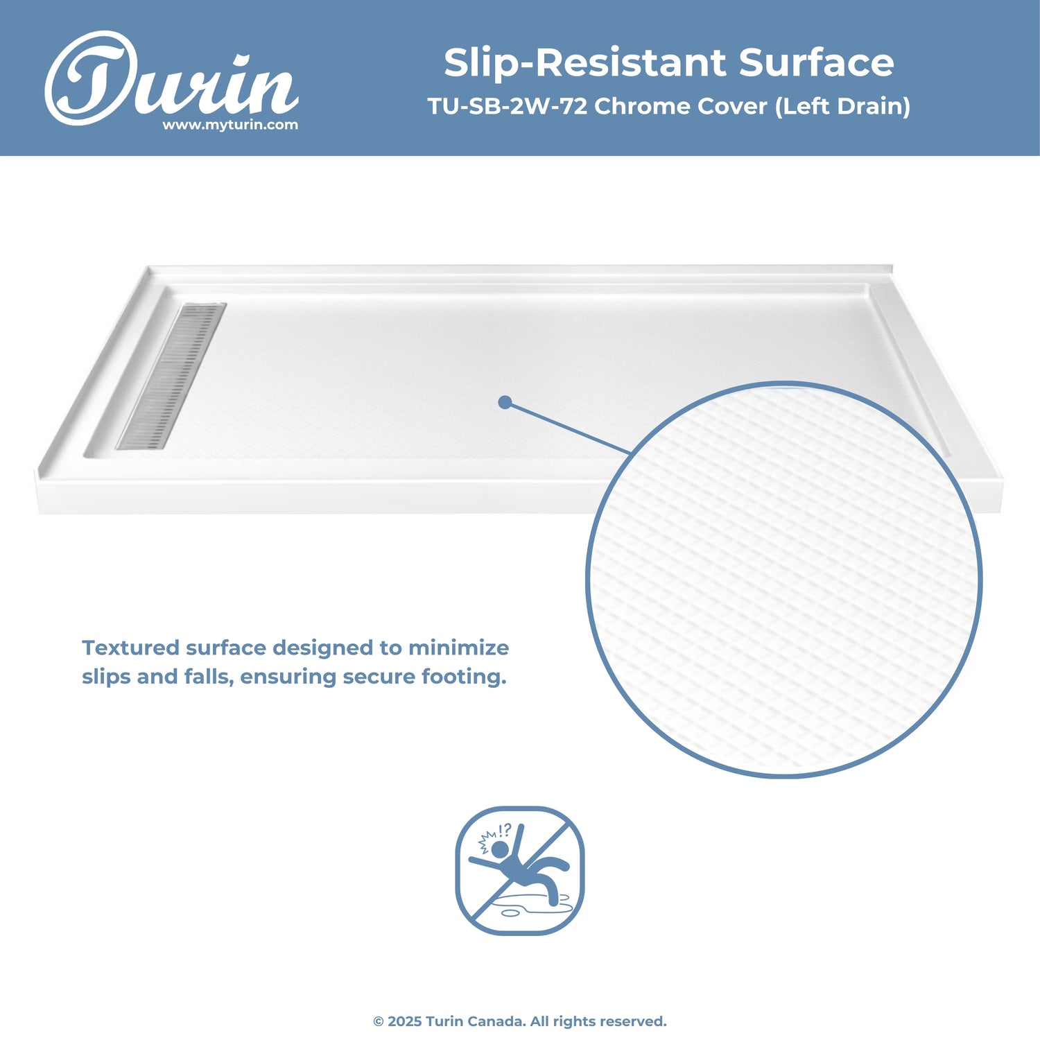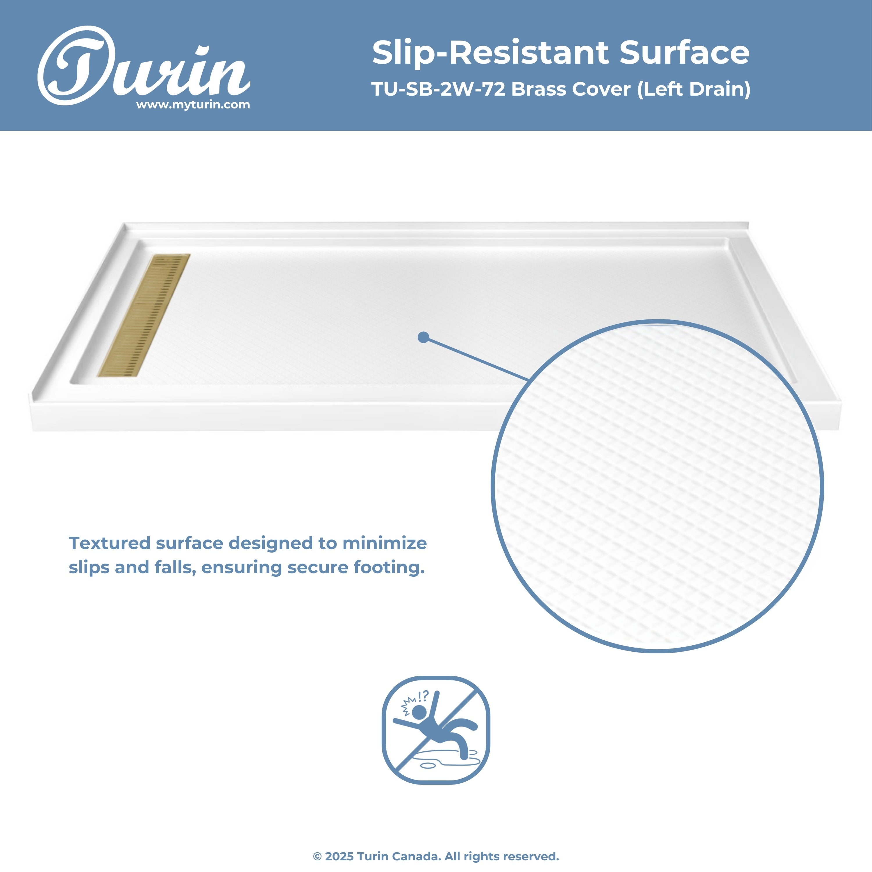 The Turin LinearLux Corner Shower Base offers a spacious 72" corner design, ideal for maximizing bathroom space. Its sleek aesthetics are complemented by a stainless steel linear drain cover, available in a variety of finishes to match your style. Integrated tile flanges, positioned against surrounding walls, ensure leak-proof tiling and simplify installation. The slip-resistant surface prioritizes safety, providing dependable traction for all users. Crafted from high-quality, durable acrylic that resists scratches and stains for lasting performance and beauty.