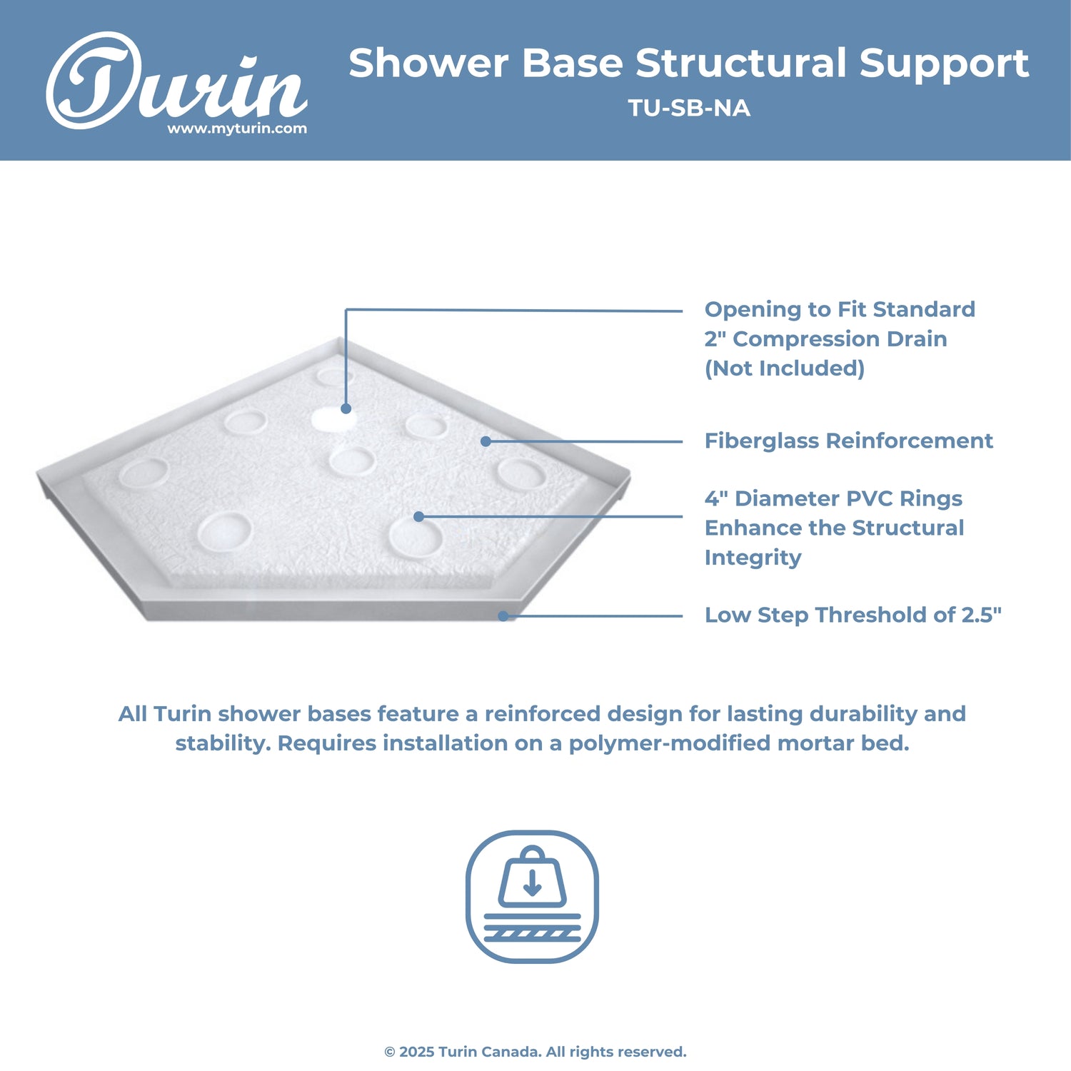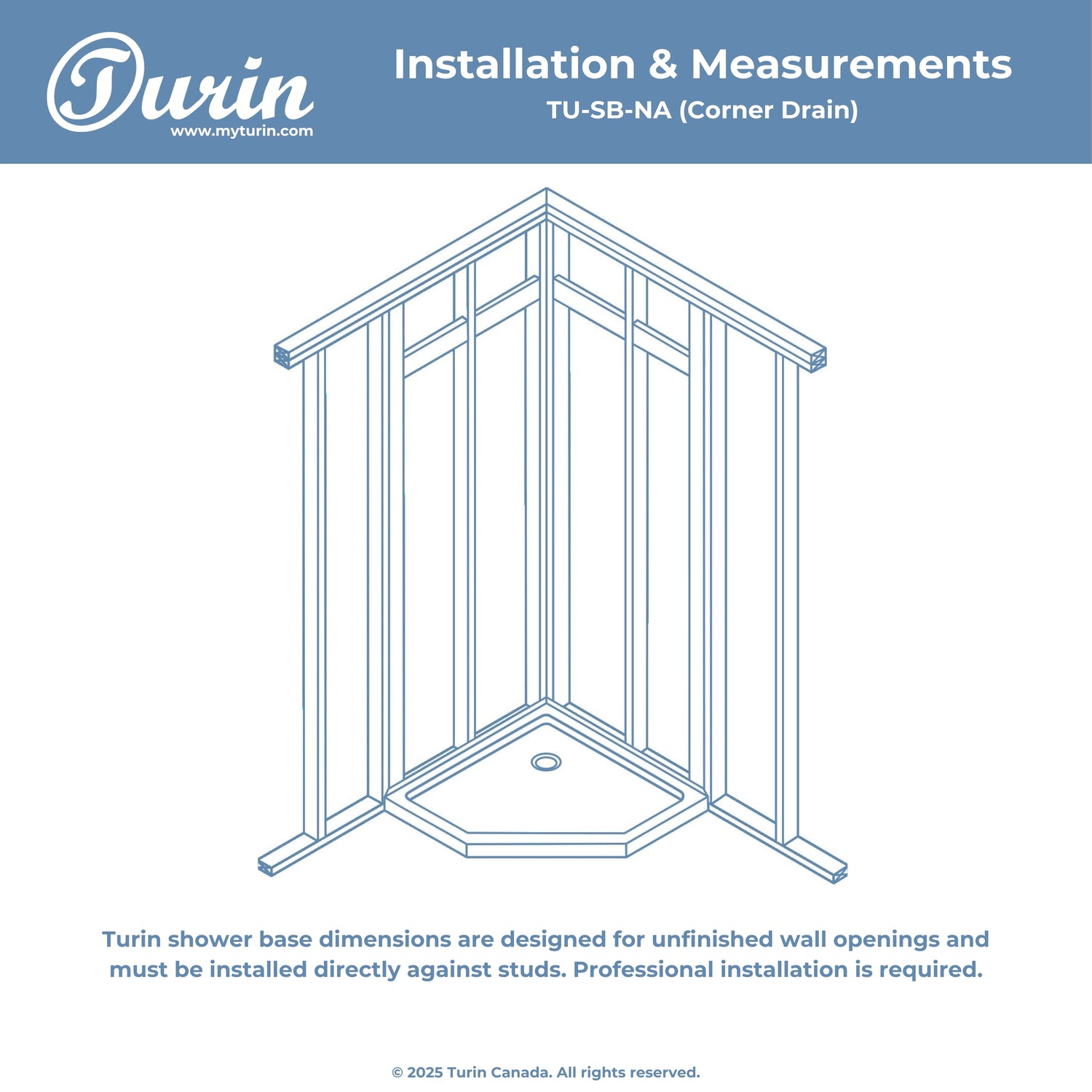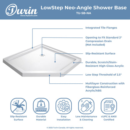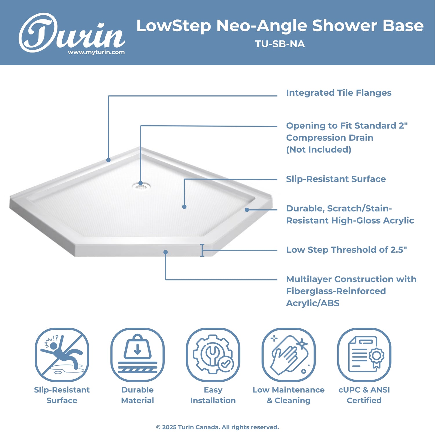 Turin LowStep Neo-Angle Shower Base is the ideal solution for unique bathroom spaces, featuring a low-profile threshold height of 2.5 inches and an angular design to optimize corner installations. This model offers both style and practicality, creating a modern, accessible shower solution in a compact, space-saving design. Integrated tile flanges, positioned against surrounding walls, ensure leak-proof tiling and simplify installation. The slip-resistant surface prioritizes safety, providing dependable traction for all users. Crafted from high-quality, durable acrylic that resists scratches and stains for lasting performance and beauty.