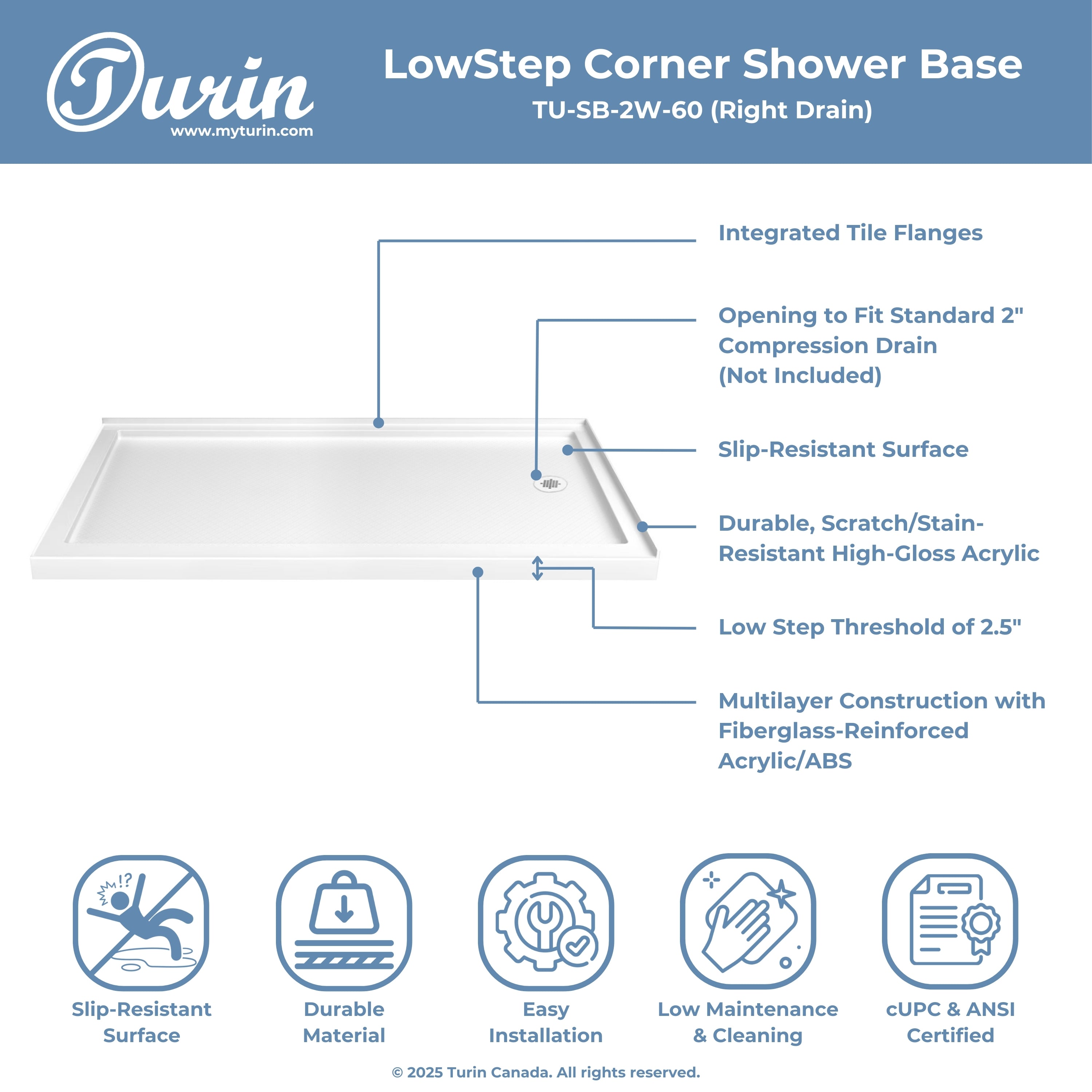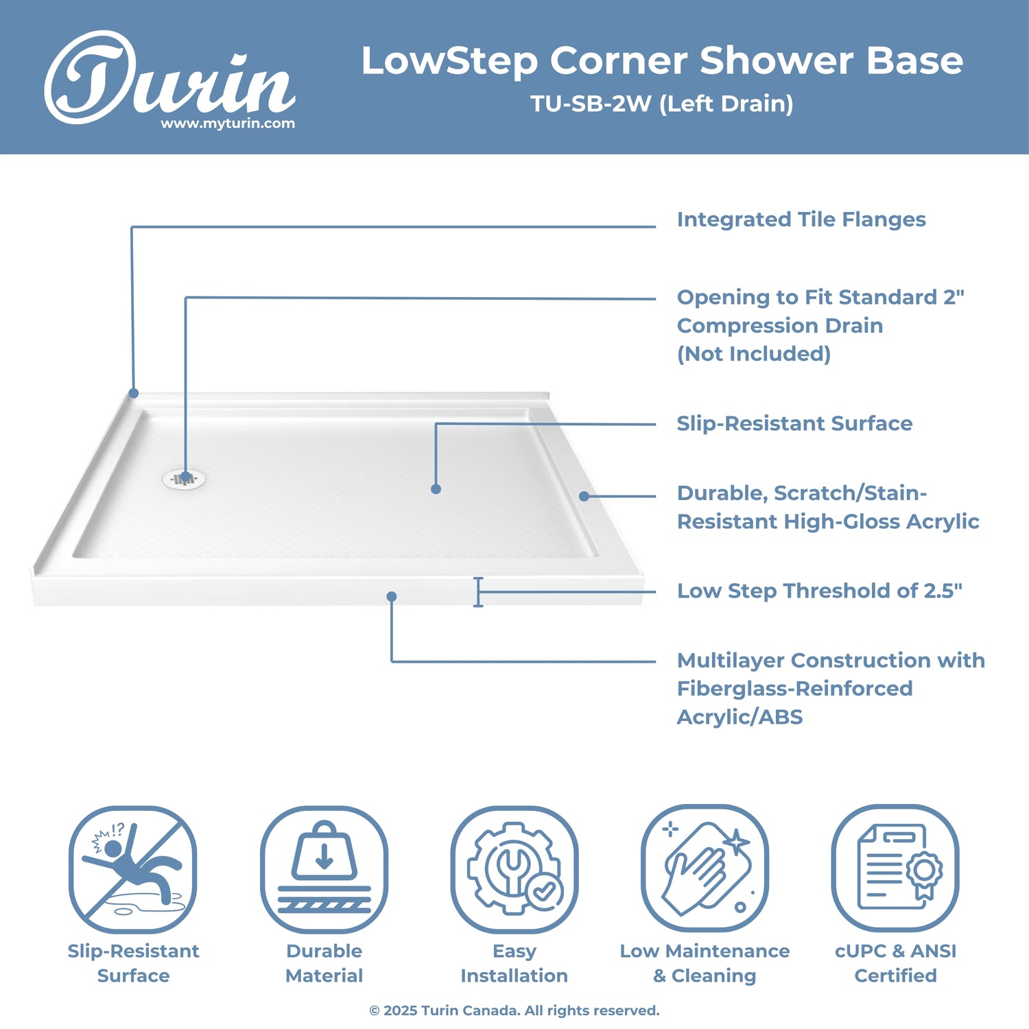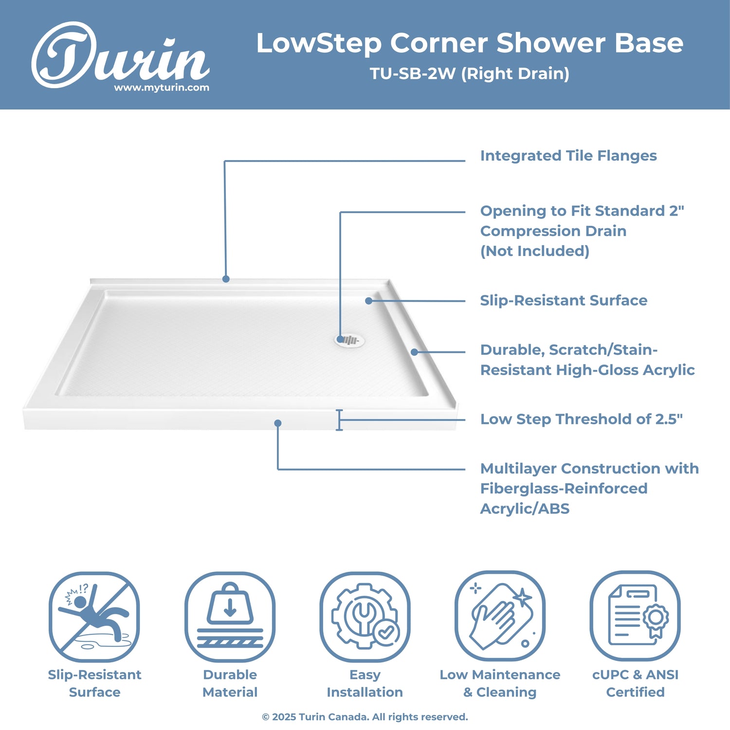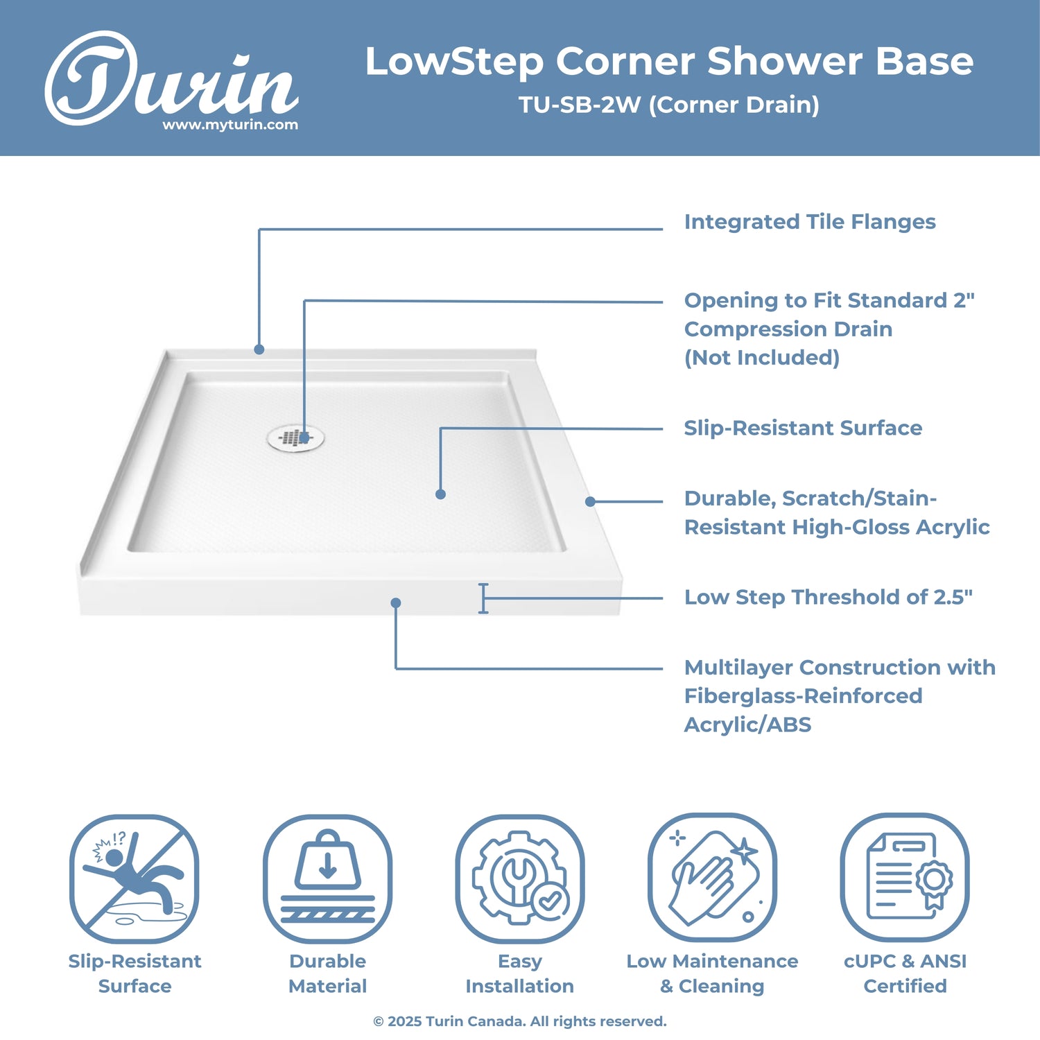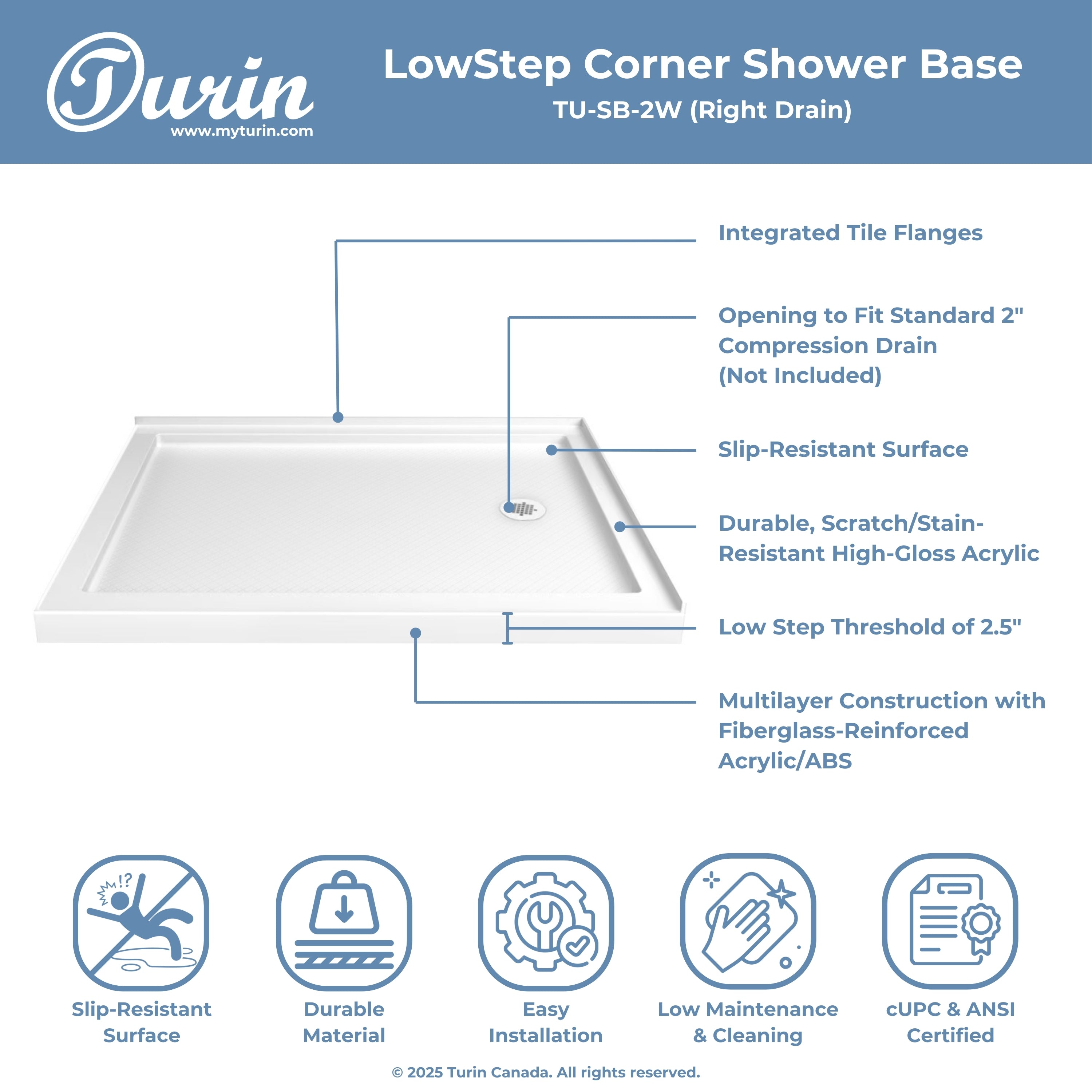 The Turin LowStep Corner Shower Base combines a low-profile design with corner installation for a compact, modern solution. With a threshold height of 2.5 inches, this shower base offers easy access while maintaining its sleek design. Ideal for smaller bathrooms or unique spaces, it provides a stylish and practical showering experience. Integrated tile flanges, positioned against surrounding walls, ensure leak-proof tiling and simplify installation. The slip-resistant surface prioritizes safety, providing dependable traction for all users. Crafted from high-quality, durable acrylic that resists scratches and stains for lasting performance and beauty.