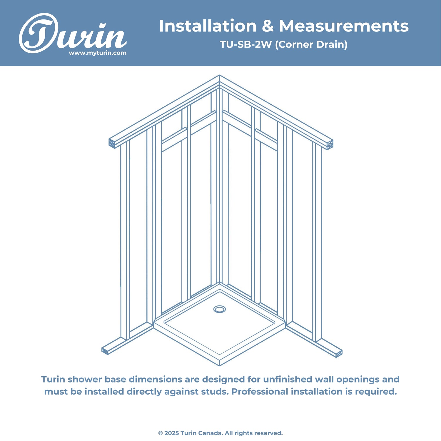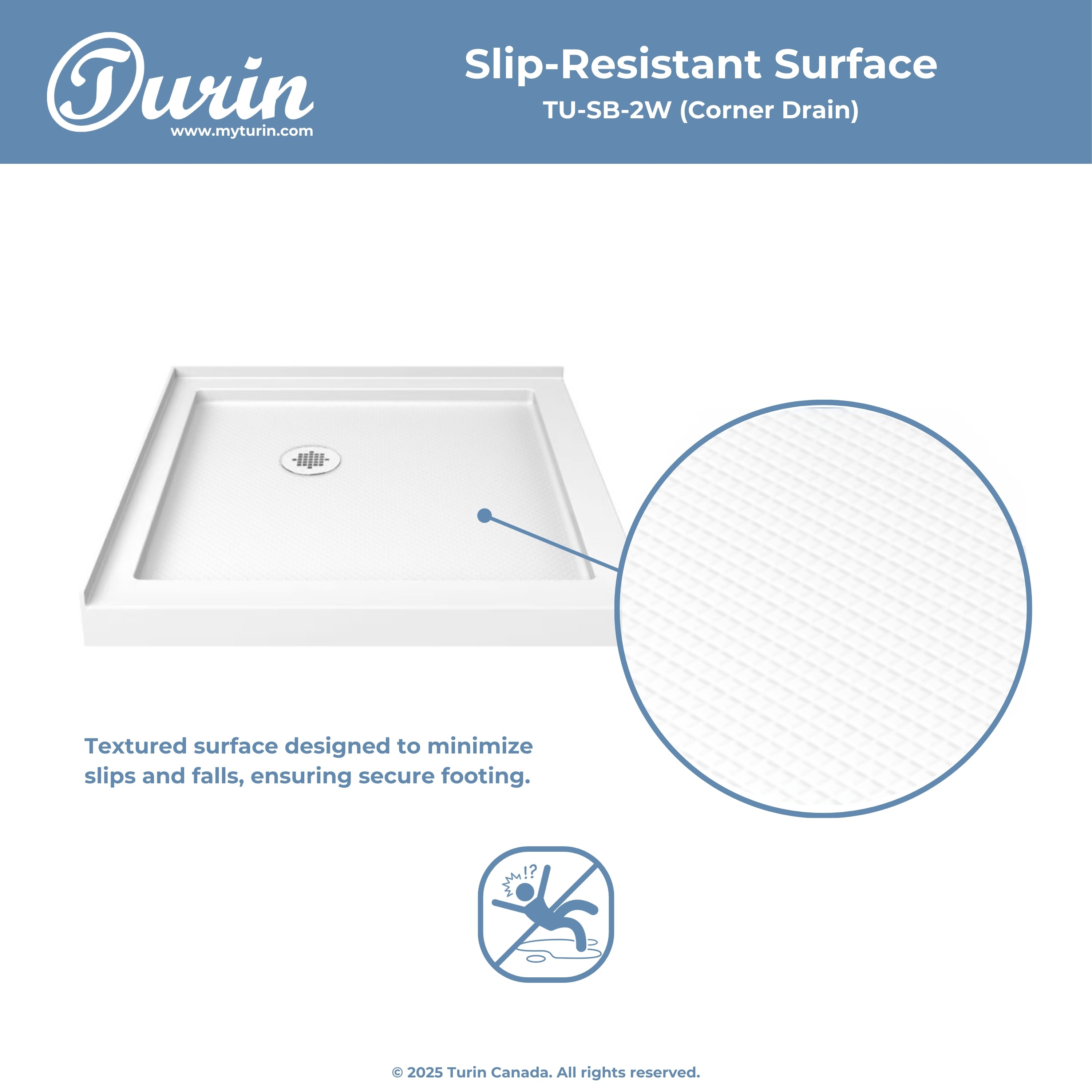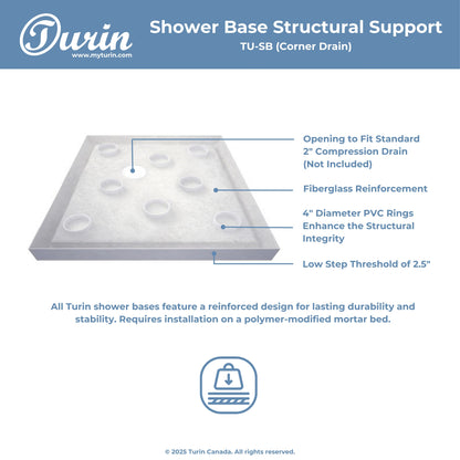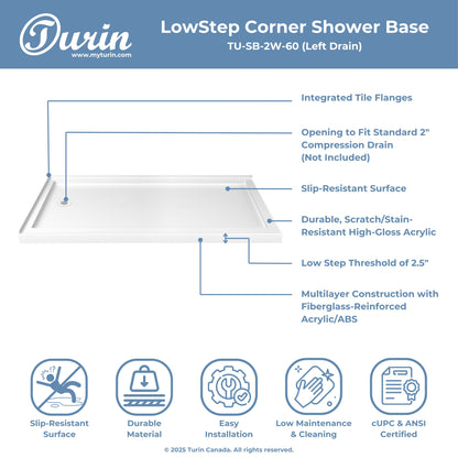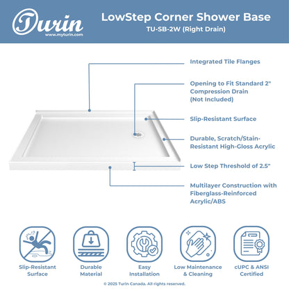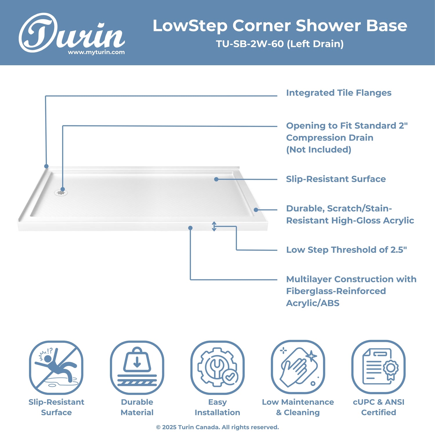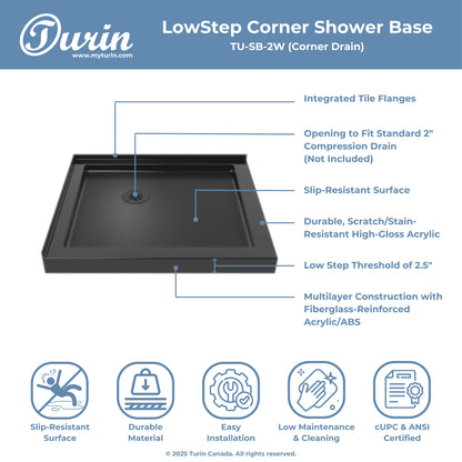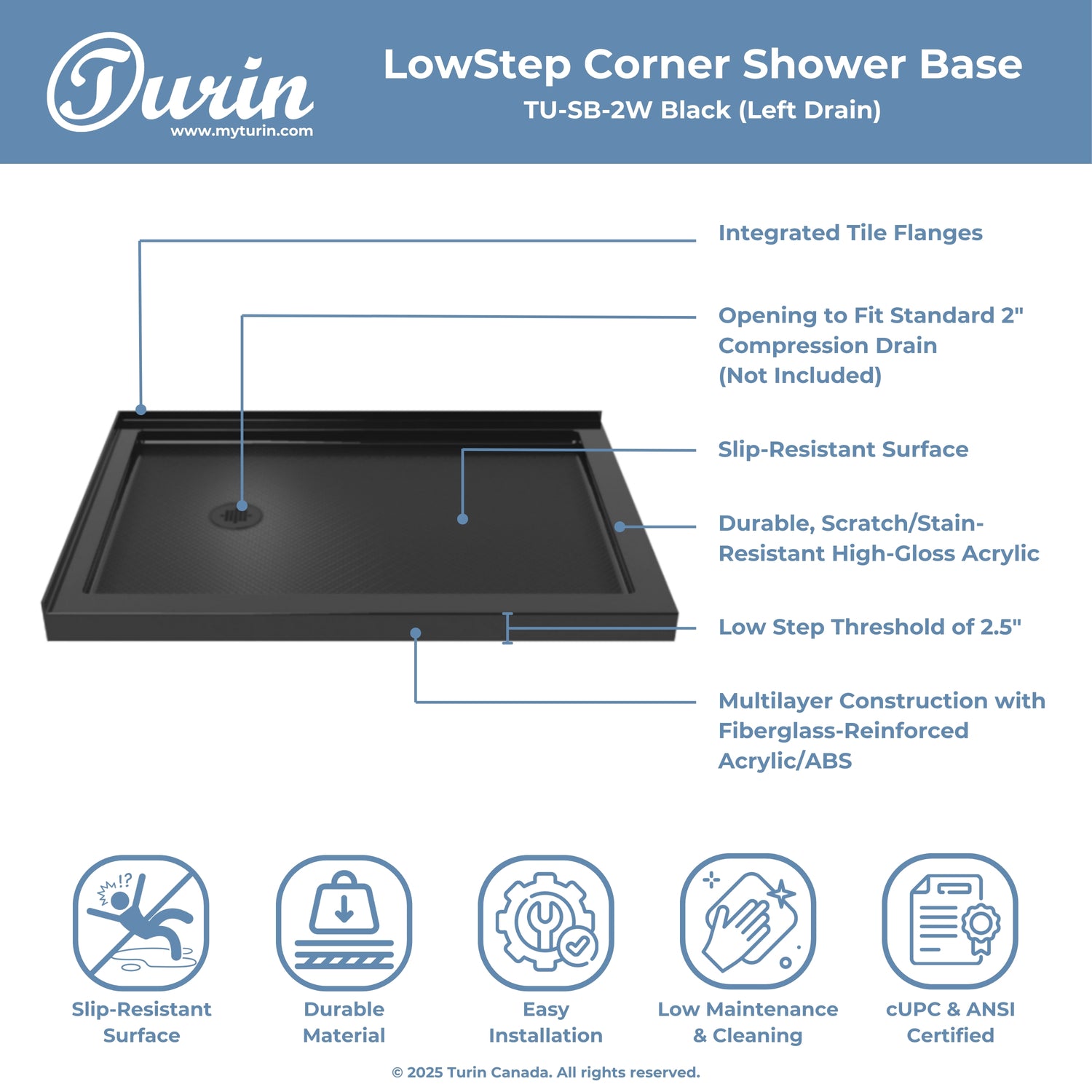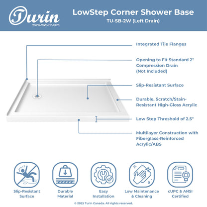 The Turin LowStep Corner Shower Base combines a low-profile design with corner installation for a compact, modern solution. With a threshold height of 2.5 inches, this shower base offers easy access while maintaining its sleek design. Ideal for smaller bathrooms or unique spaces, it provides a stylish and practical showering experience. Integrated tile flanges, positioned against surrounding walls, ensure leak-proof tiling and simplify installation. The slip-resistant surface prioritizes safety, providing dependable traction for all users. Crafted from high-quality, durable acrylic that resists scratches and stains for lasting performance and beauty.