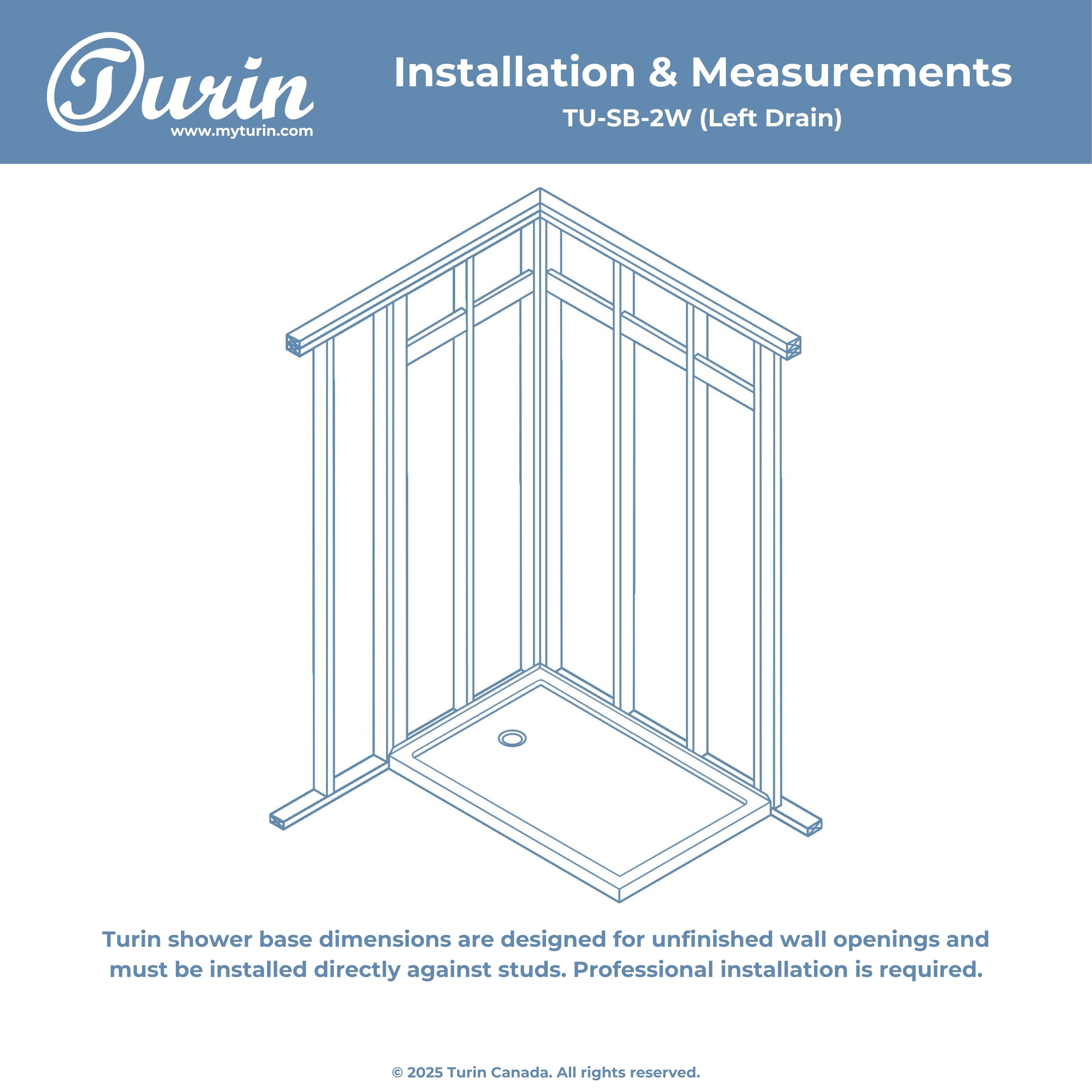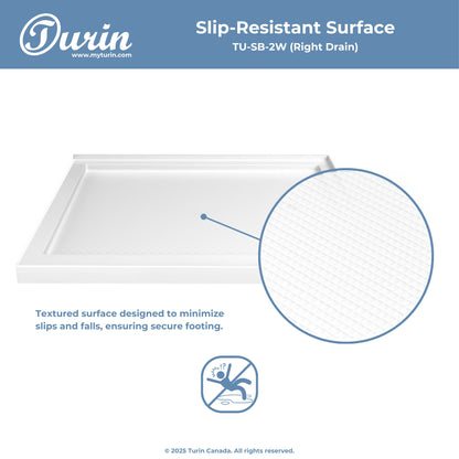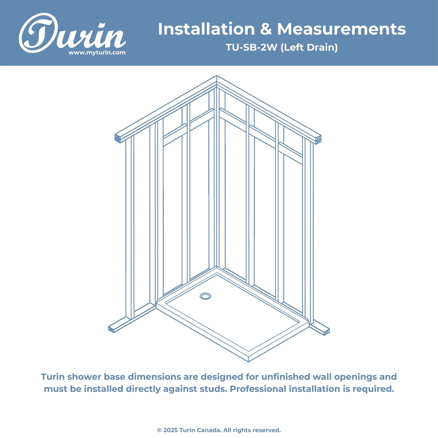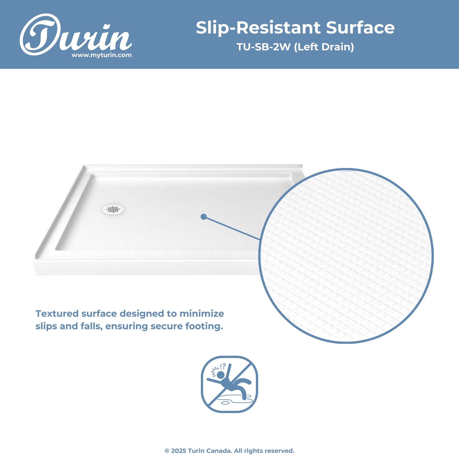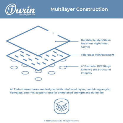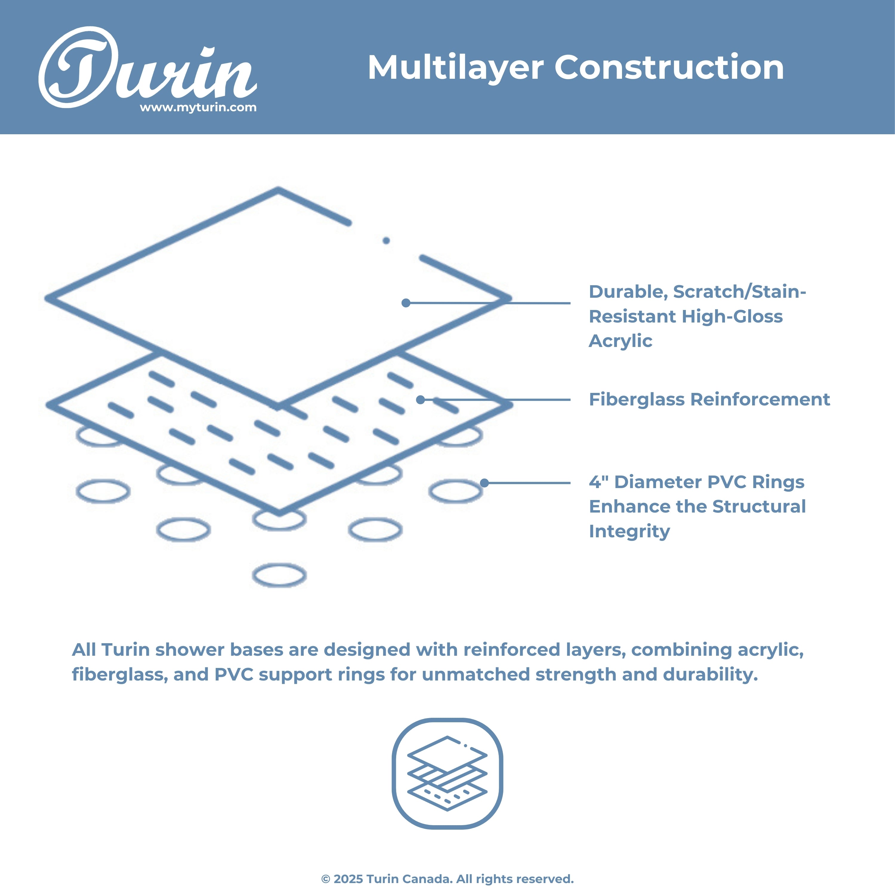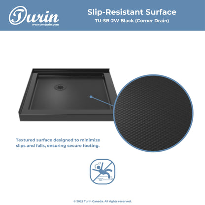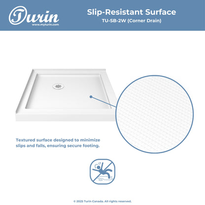The Turin LowStep Corner Shower Base combines a low-profile design with corner installation for a compact, modern solution. With a threshold height of 2.5 inches, this shower base offers easy access while maintaining its sleek design. Ideal for smaller bathrooms or unique spaces, it provides a stylish and practical showering experience. Integrated tile flanges, positioned against surrounding walls, ensure leak-proof tiling and simplify installation. The slip-resistant surface prioritizes safety, providing dependable traction for all users. Crafted from high-quality, durable acrylic that resists scratches and stains for lasting performance and beauty.