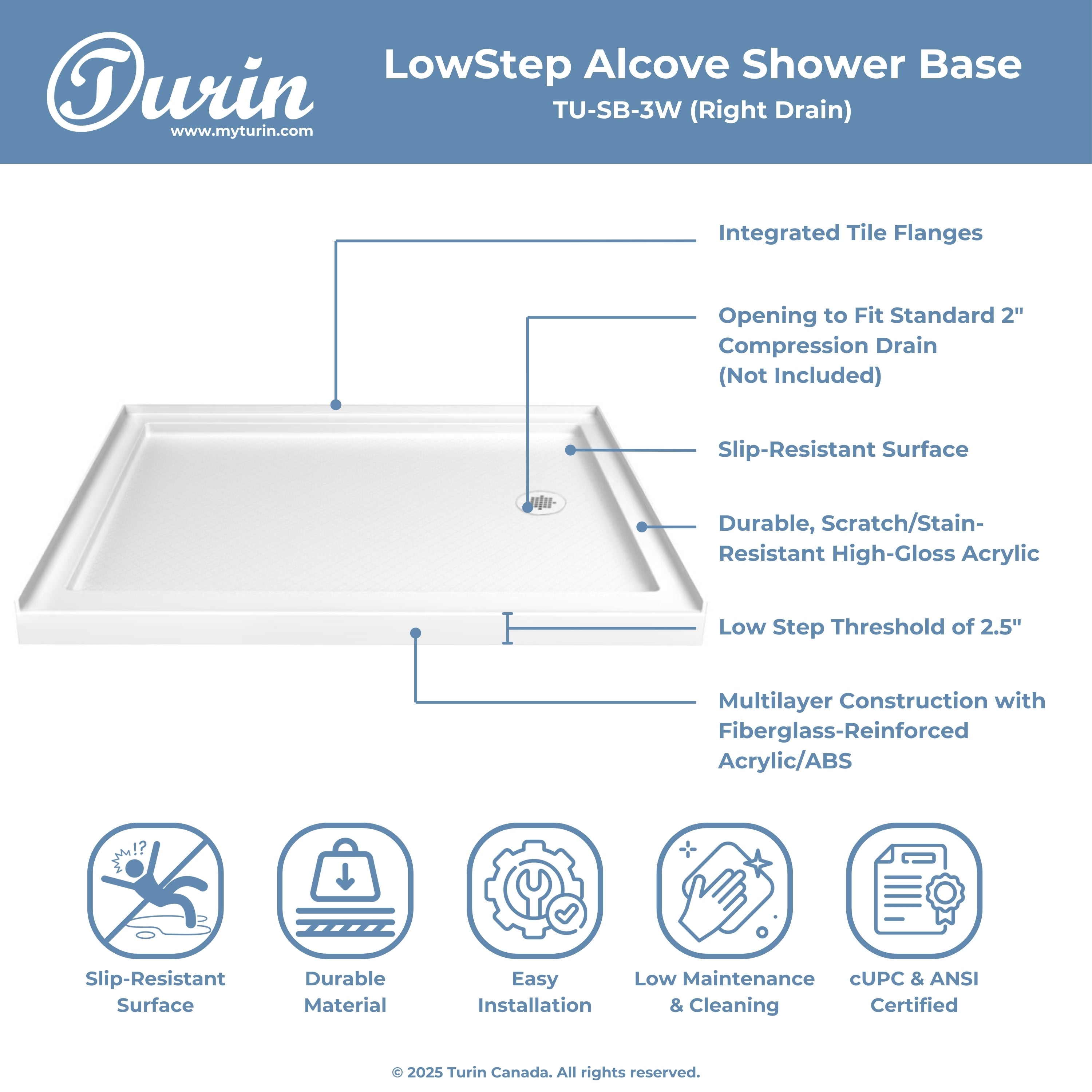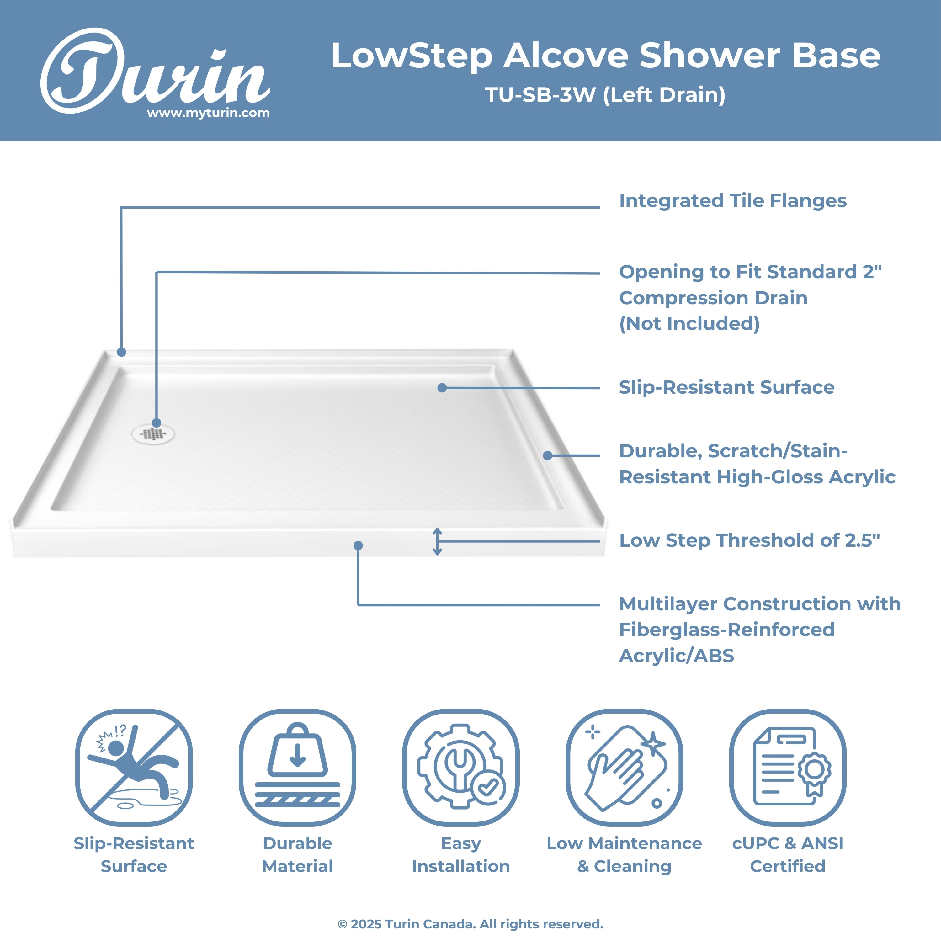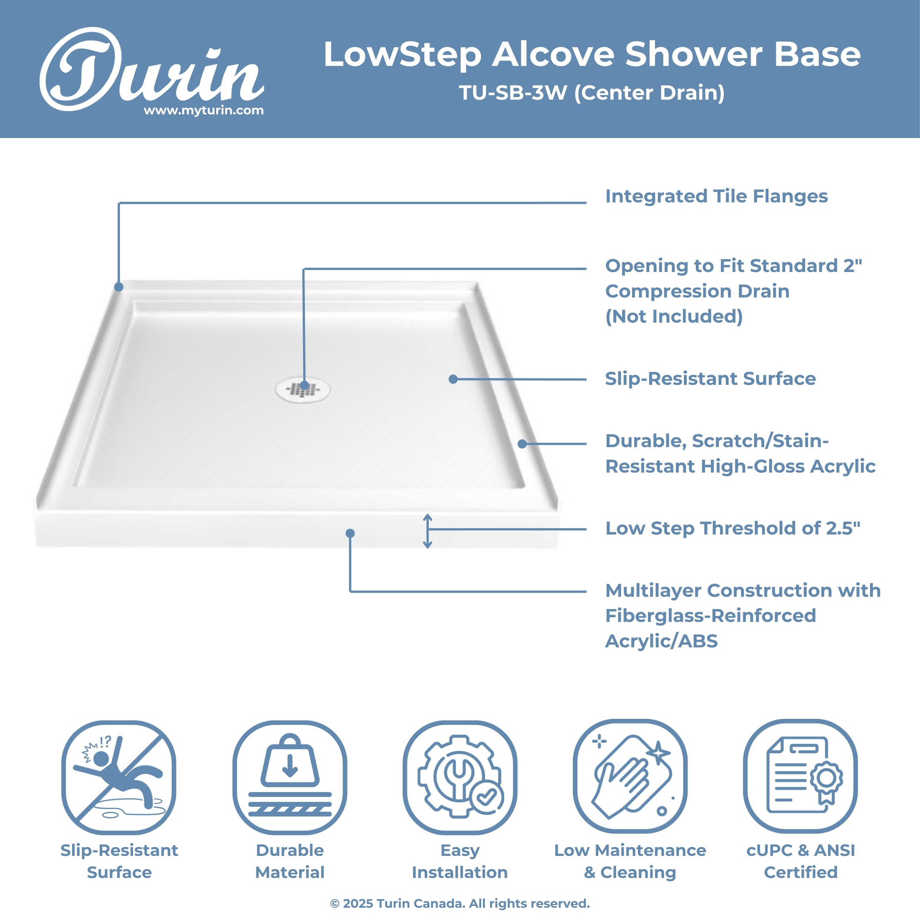 La base de douche en alcôve Turin LowStep allie un design élégant et moderne à une fonctionnalité pratique. Son profil bas de 6,35 cm améliore l'esthétique et la praticité de votre salle de bains. Les brides de carrelage intégrées, positionnées contre les murs environnants, garantissent une pose étanche et simplifient l'installation. La surface antidérapante privilégie la sécurité et offre une adhérence fiable à tous les utilisateurs. Fabriquée en acrylique durable de haute qualité, résistante aux rayures et aux taches, elle garantit une performance et une beauté durables.