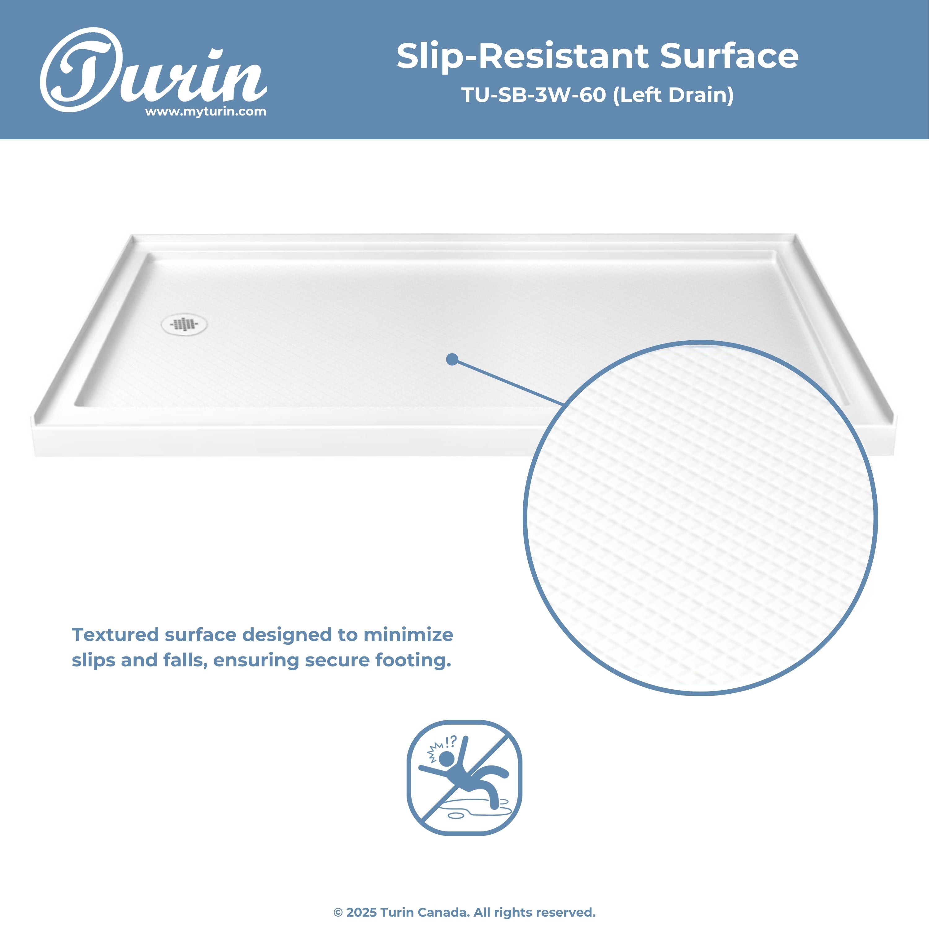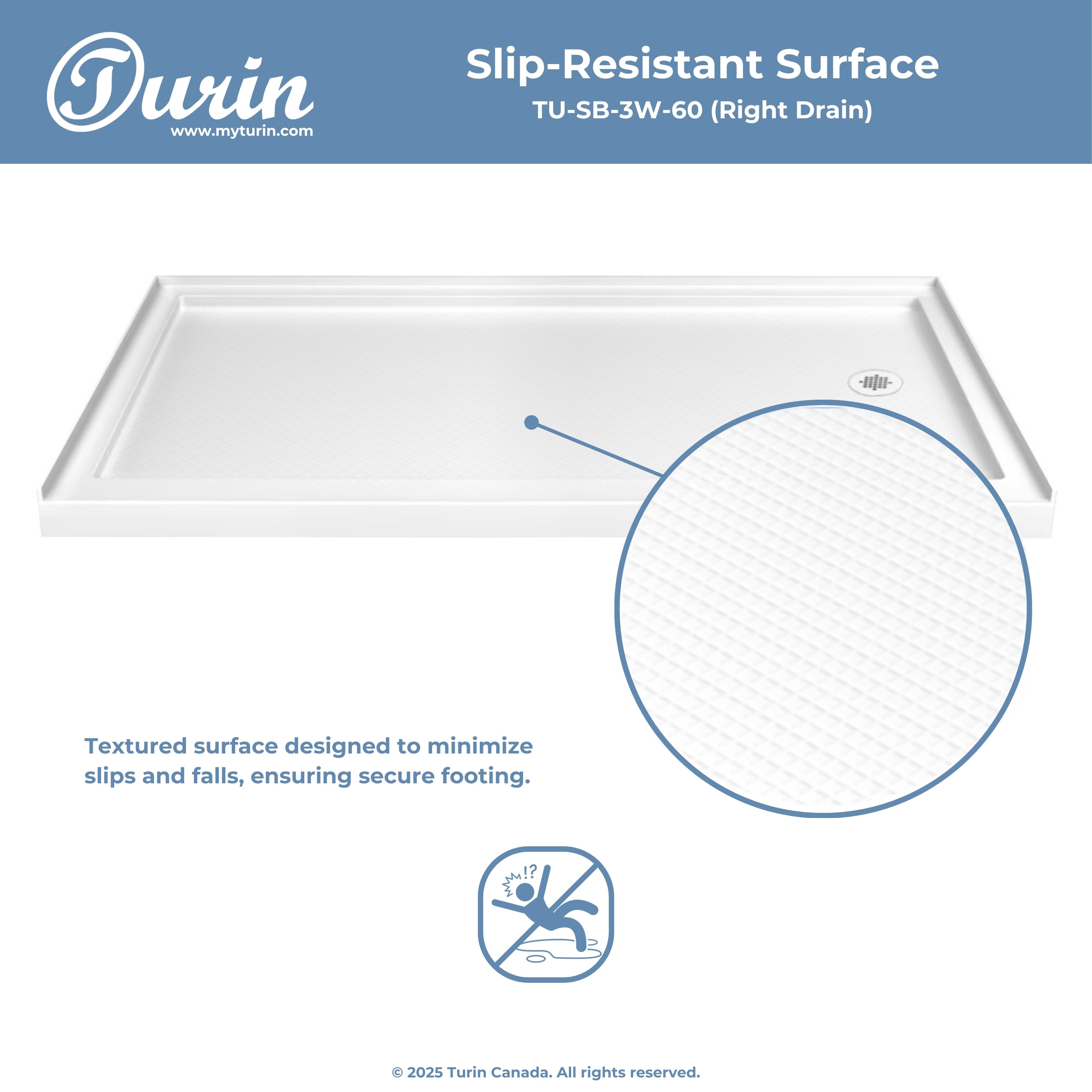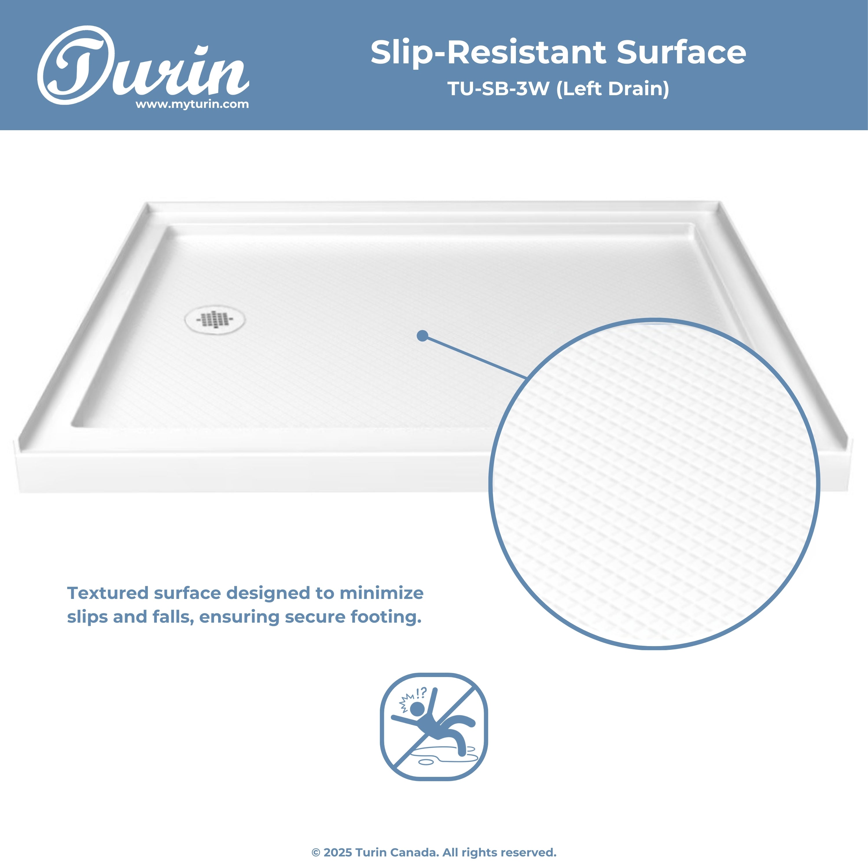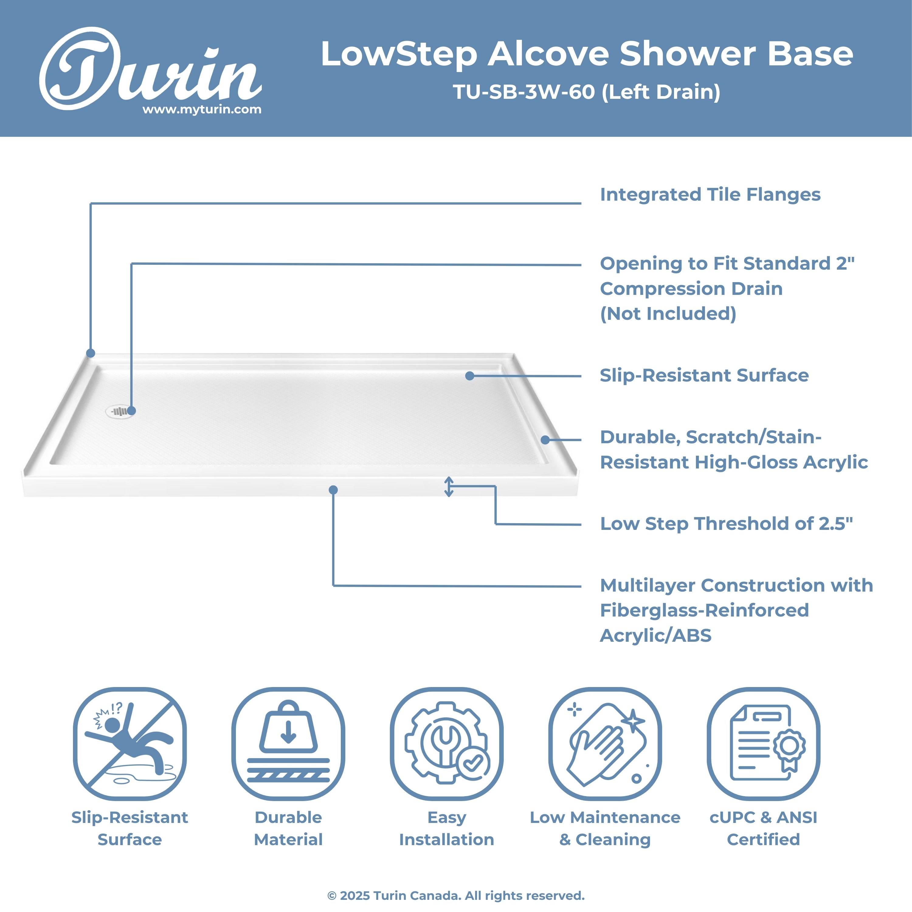 La base de douche en alcôve Turin LowStep allie un design élégant et moderne à une fonctionnalité pratique. Son profil bas de 6,35 cm améliore l'esthétique et la praticité de votre salle de bains. Les brides de carrelage intégrées, positionnées contre les murs environnants, garantissent une pose étanche et simplifient l'installation. La surface antidérapante privilégie la sécurité et offre une adhérence fiable à tous les utilisateurs. Fabriquée en acrylique durable de haute qualité, résistante aux rayures et aux taches, elle garantit une performance et une beauté durables.