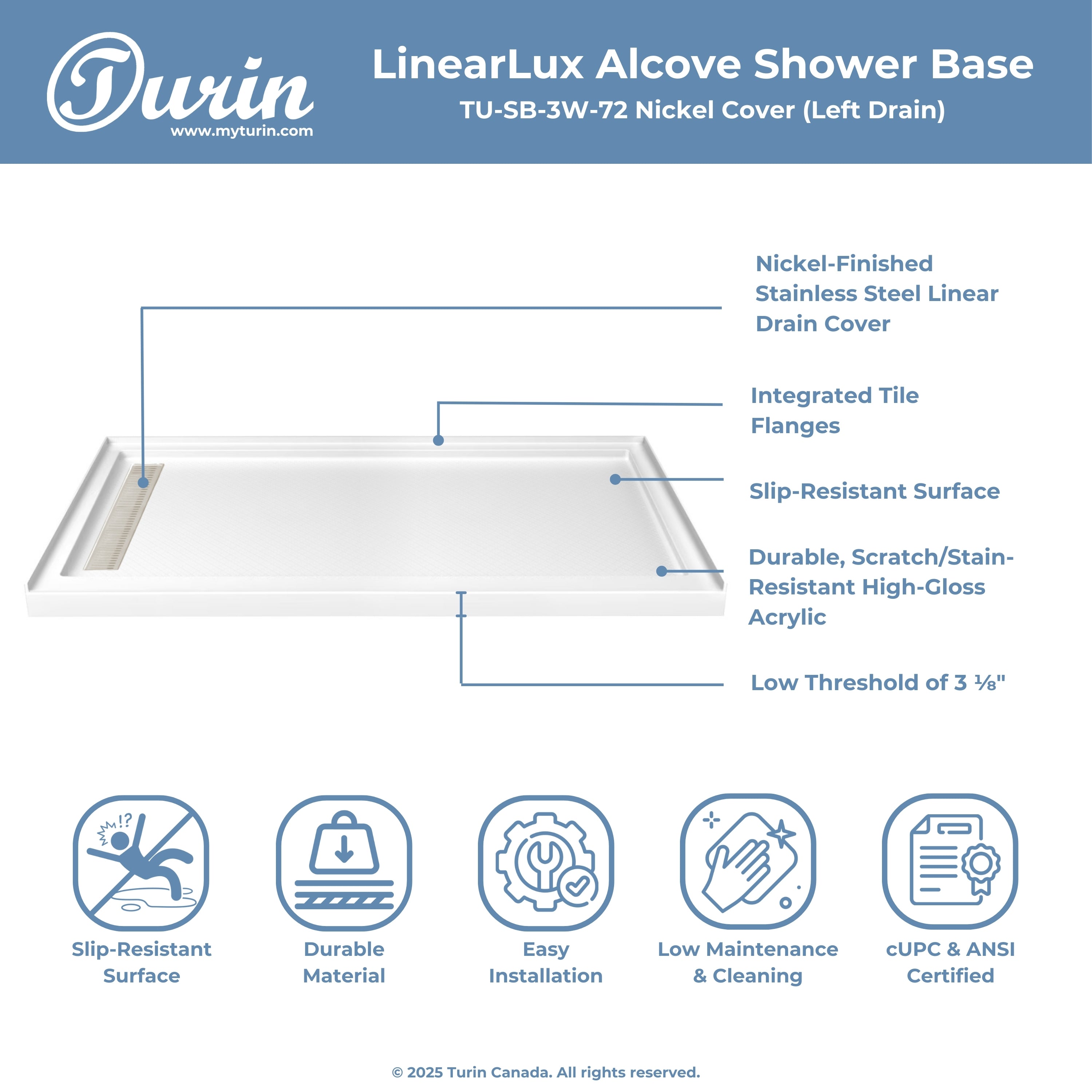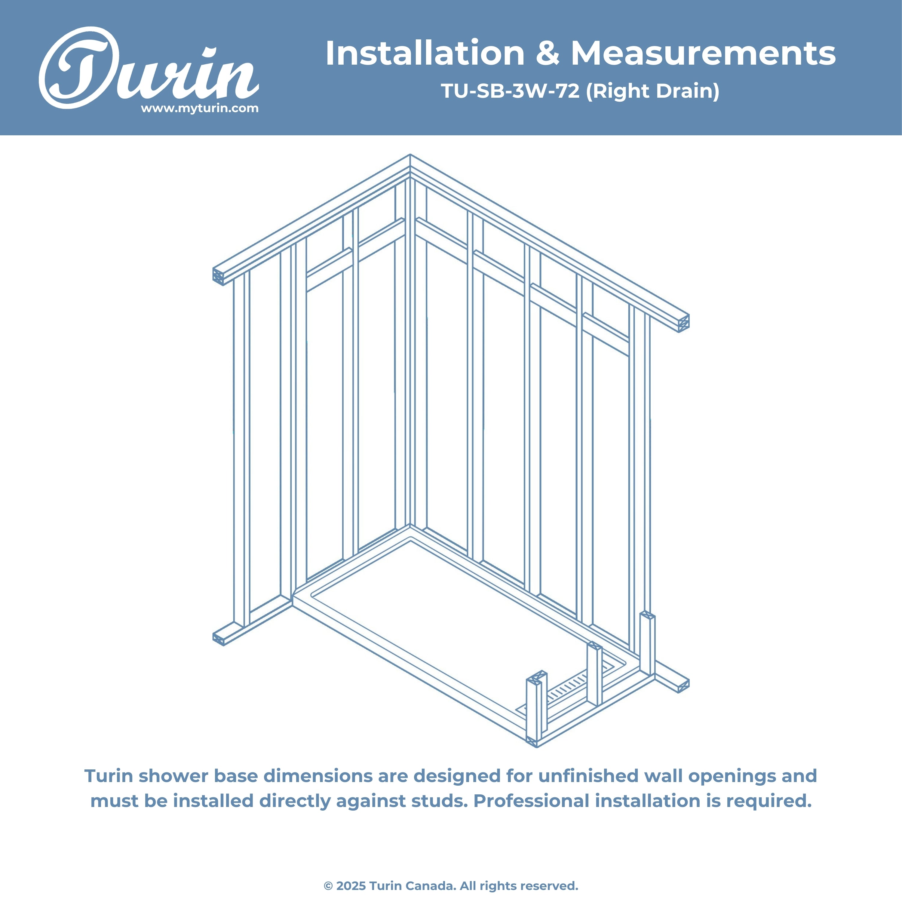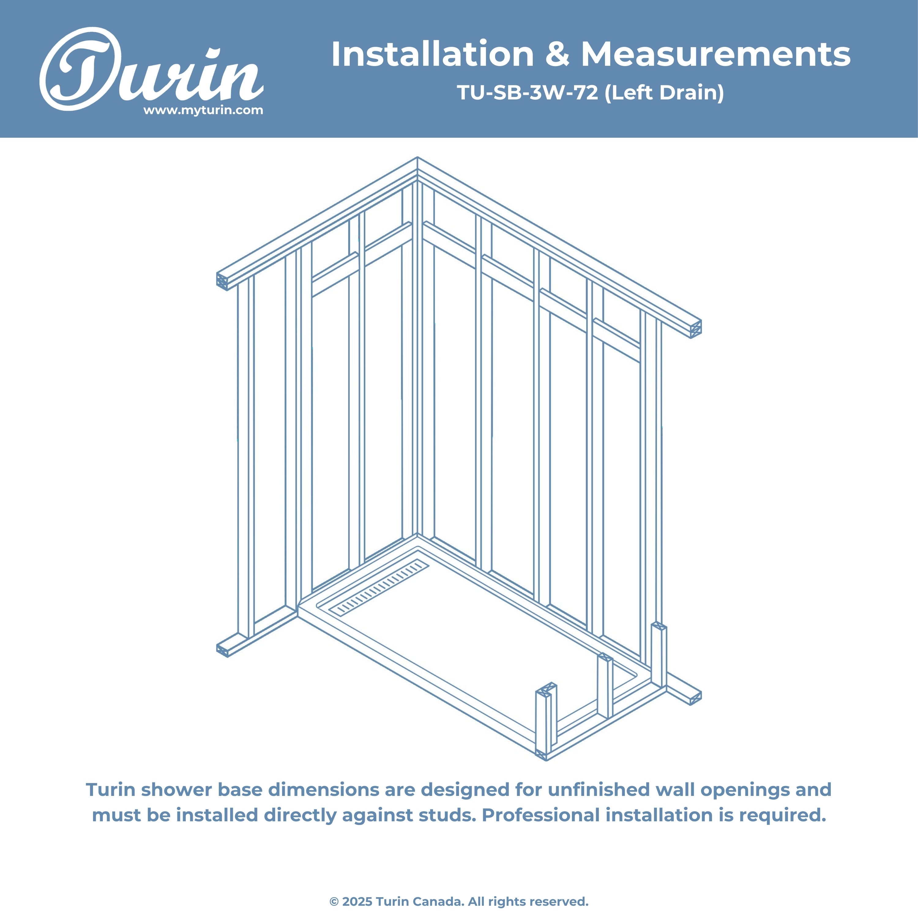 Seuil avant de douche : 2,75" (48'' et 60'') ou 3,94'' (72'')