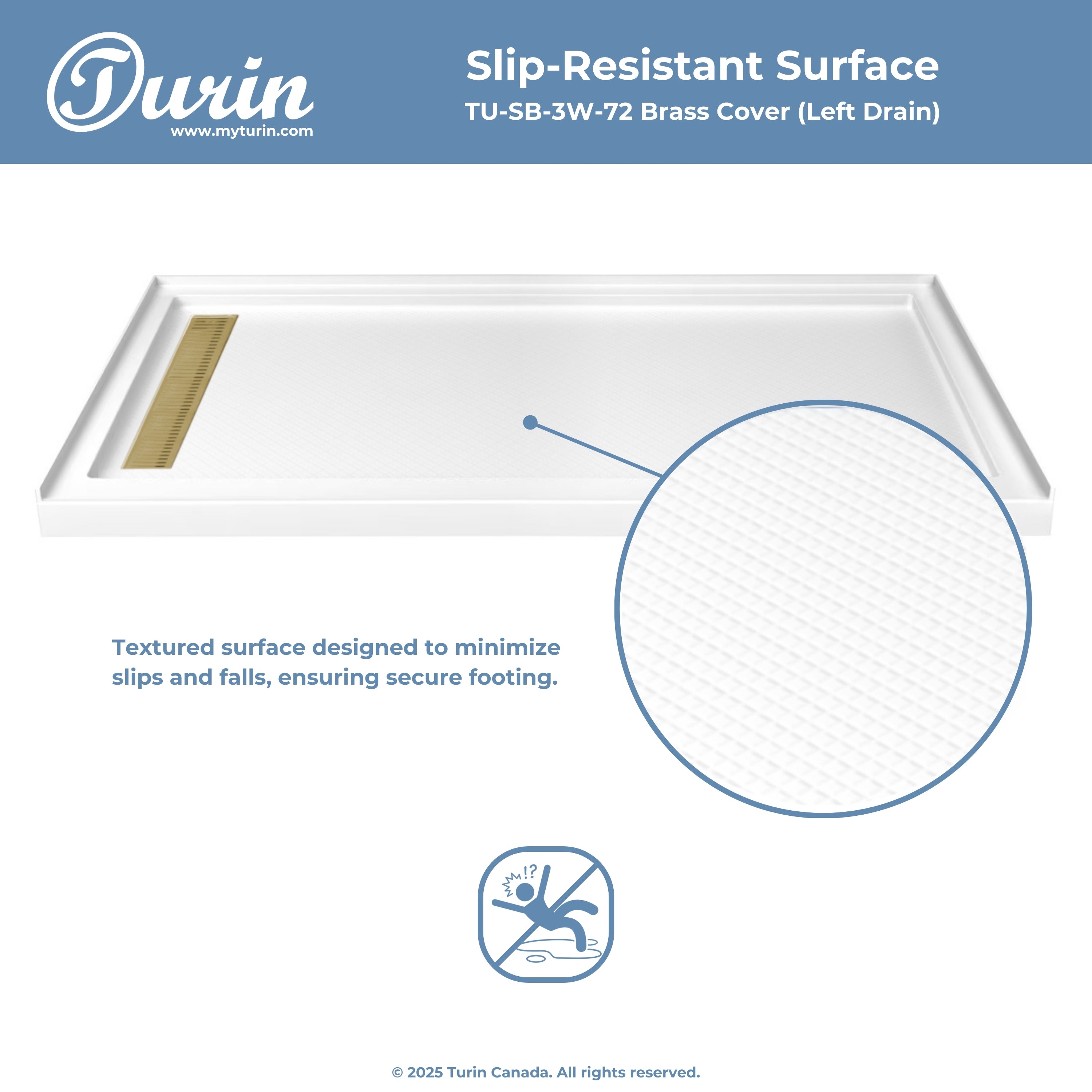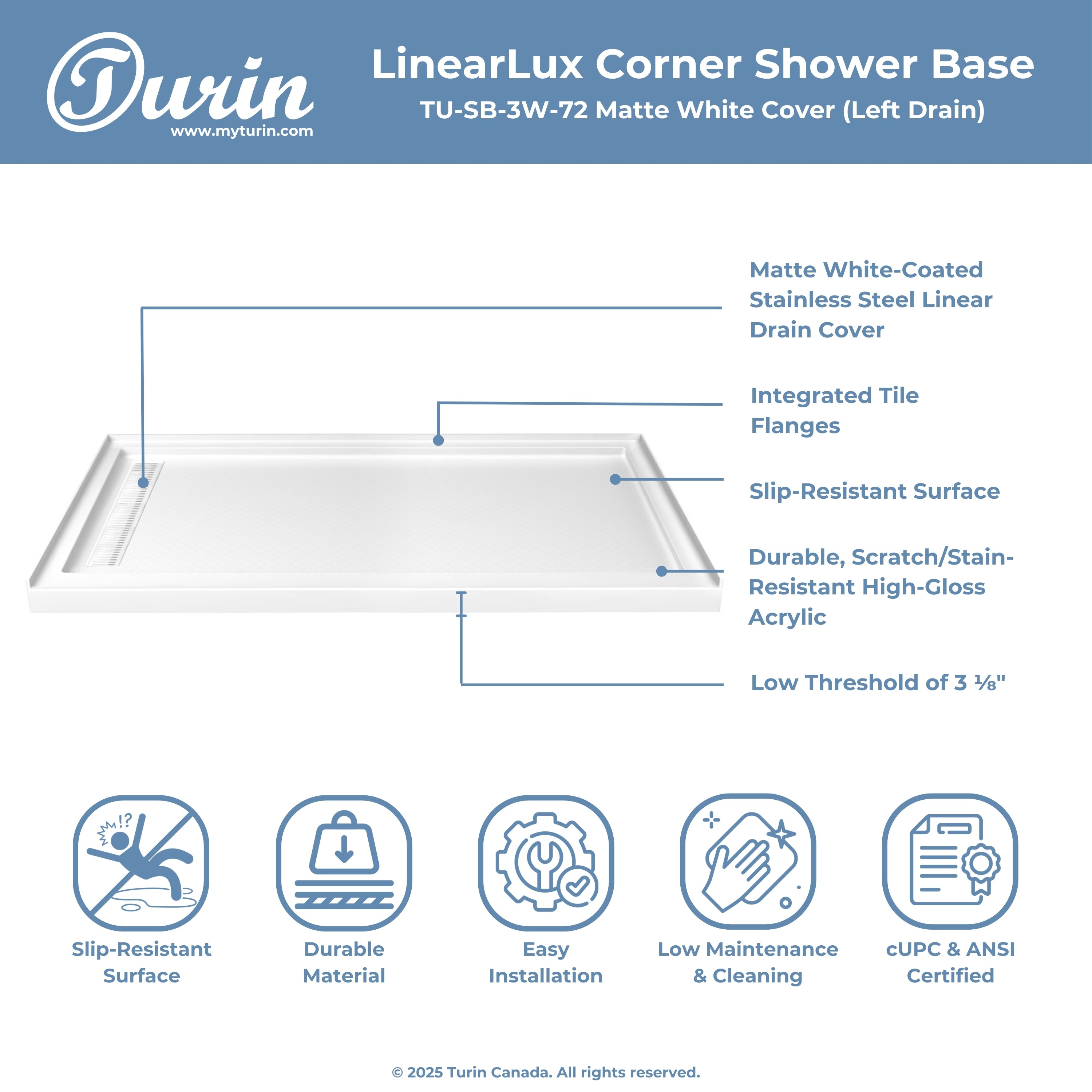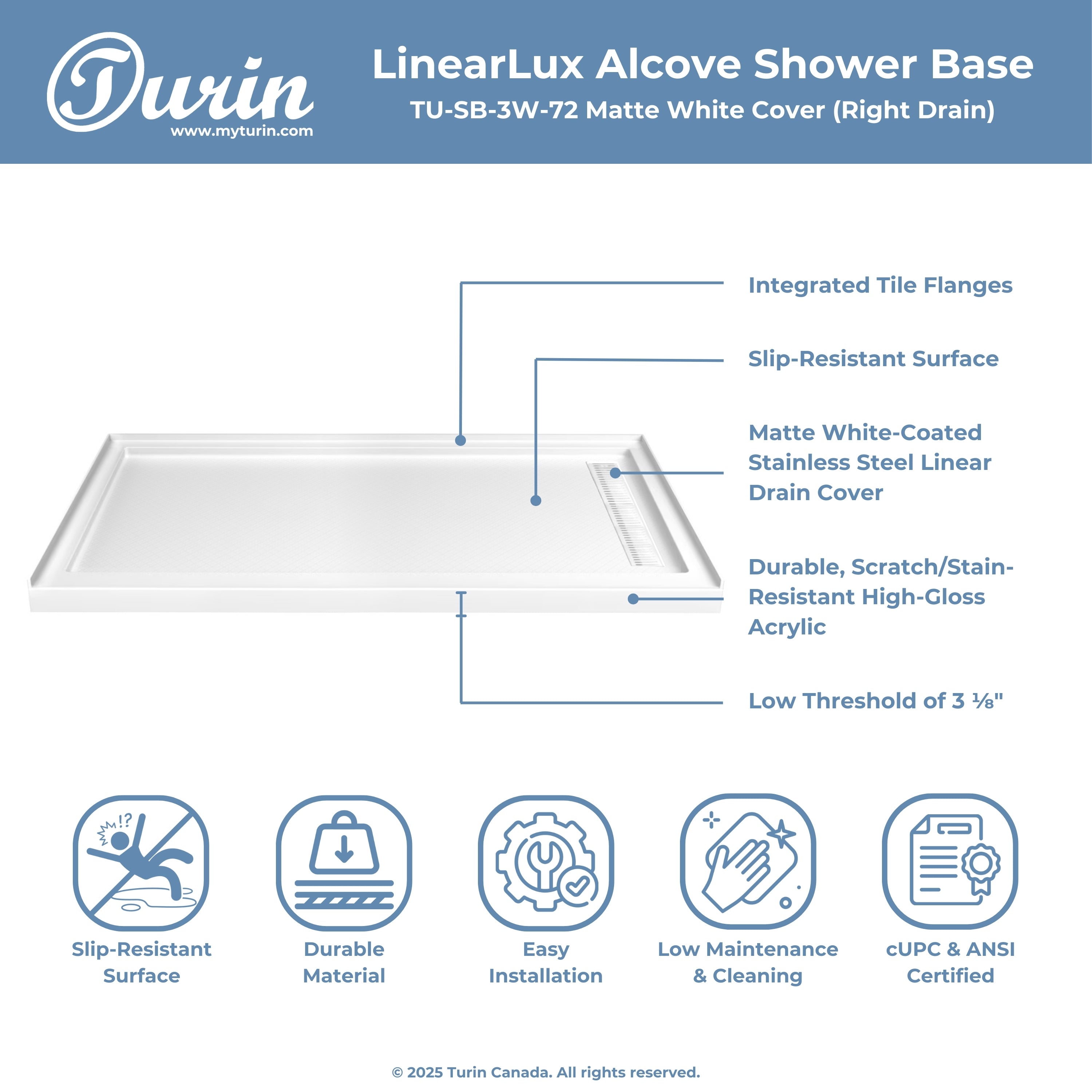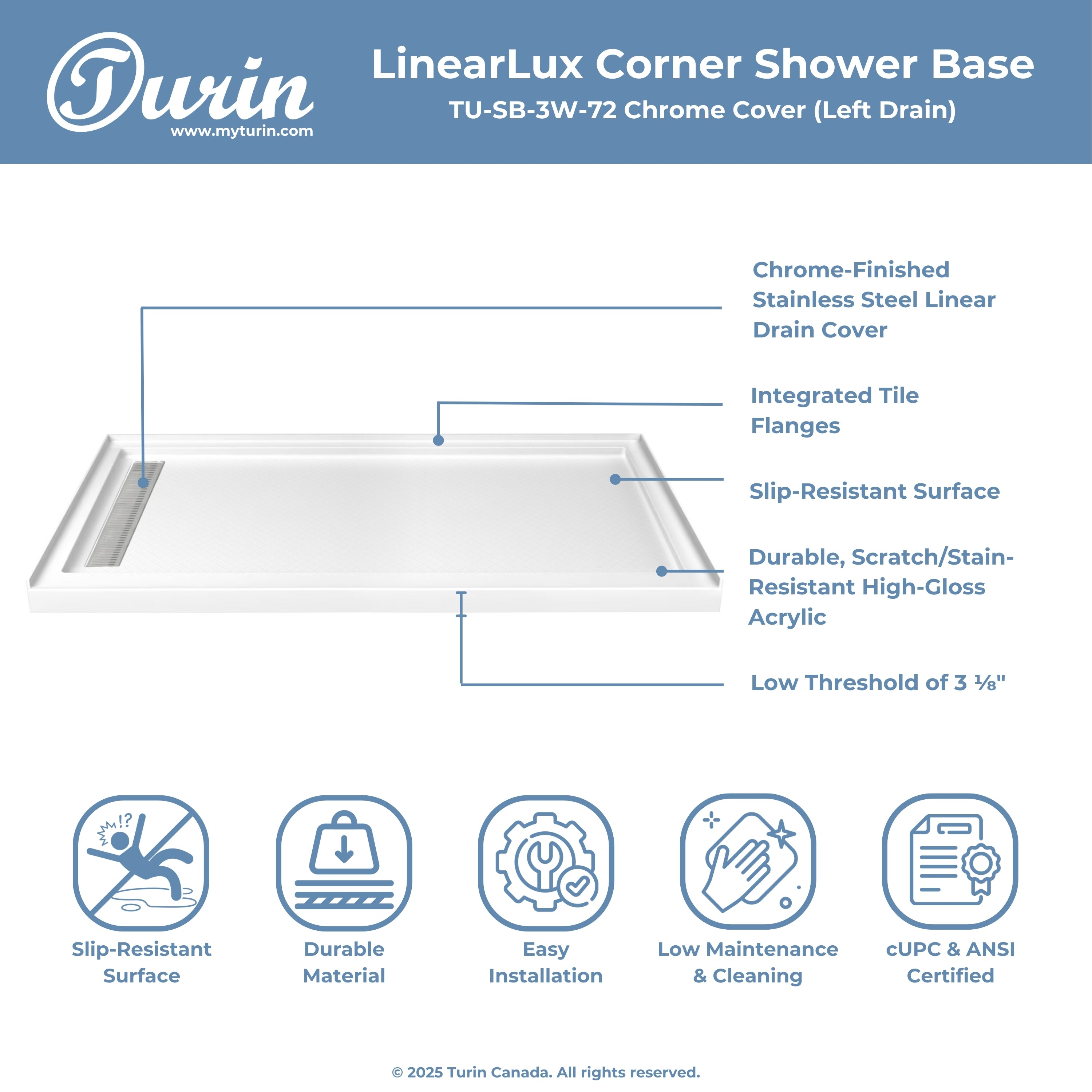 Seuil avant de douche : 2,75" (48'' et 60'') ou 3,94'' (72'')