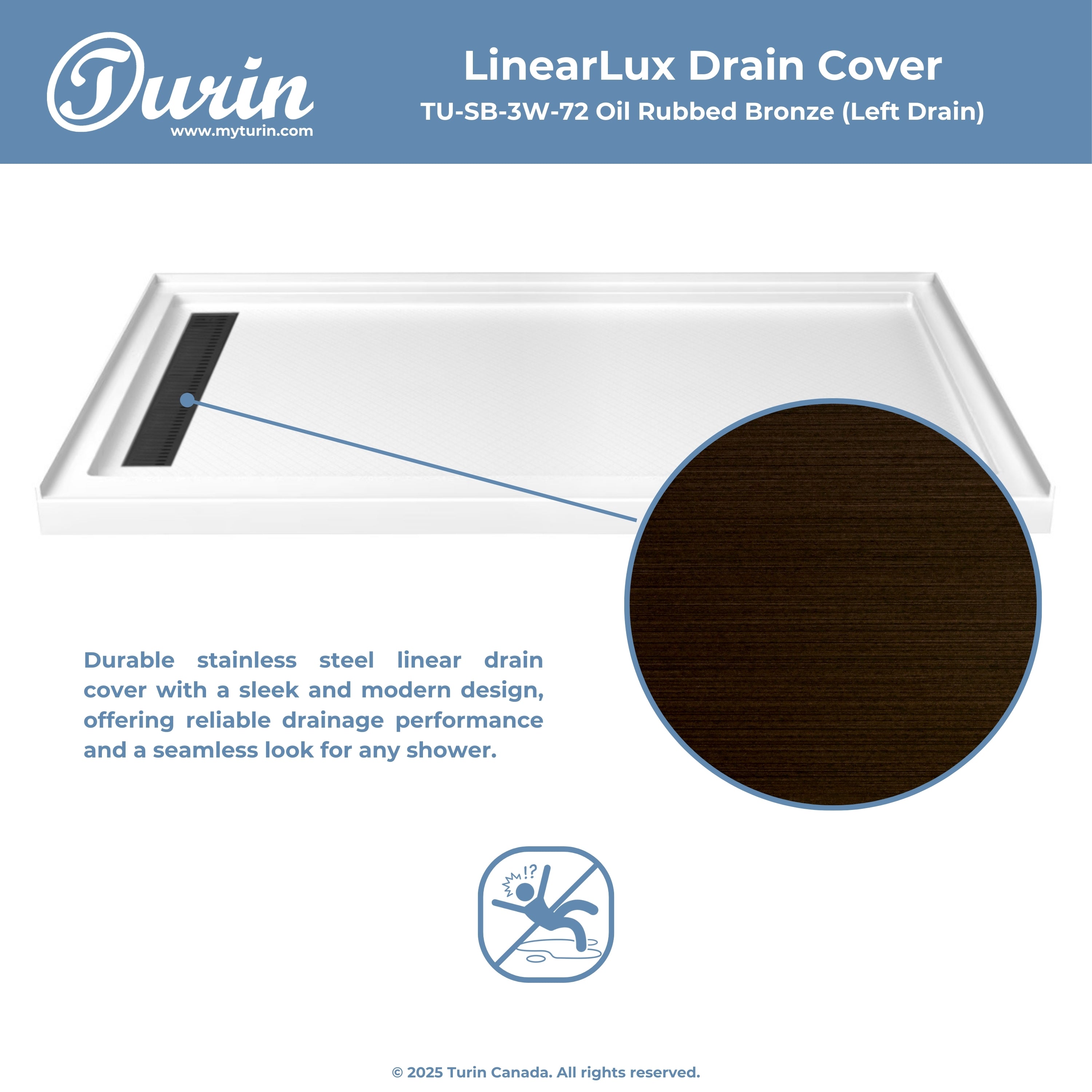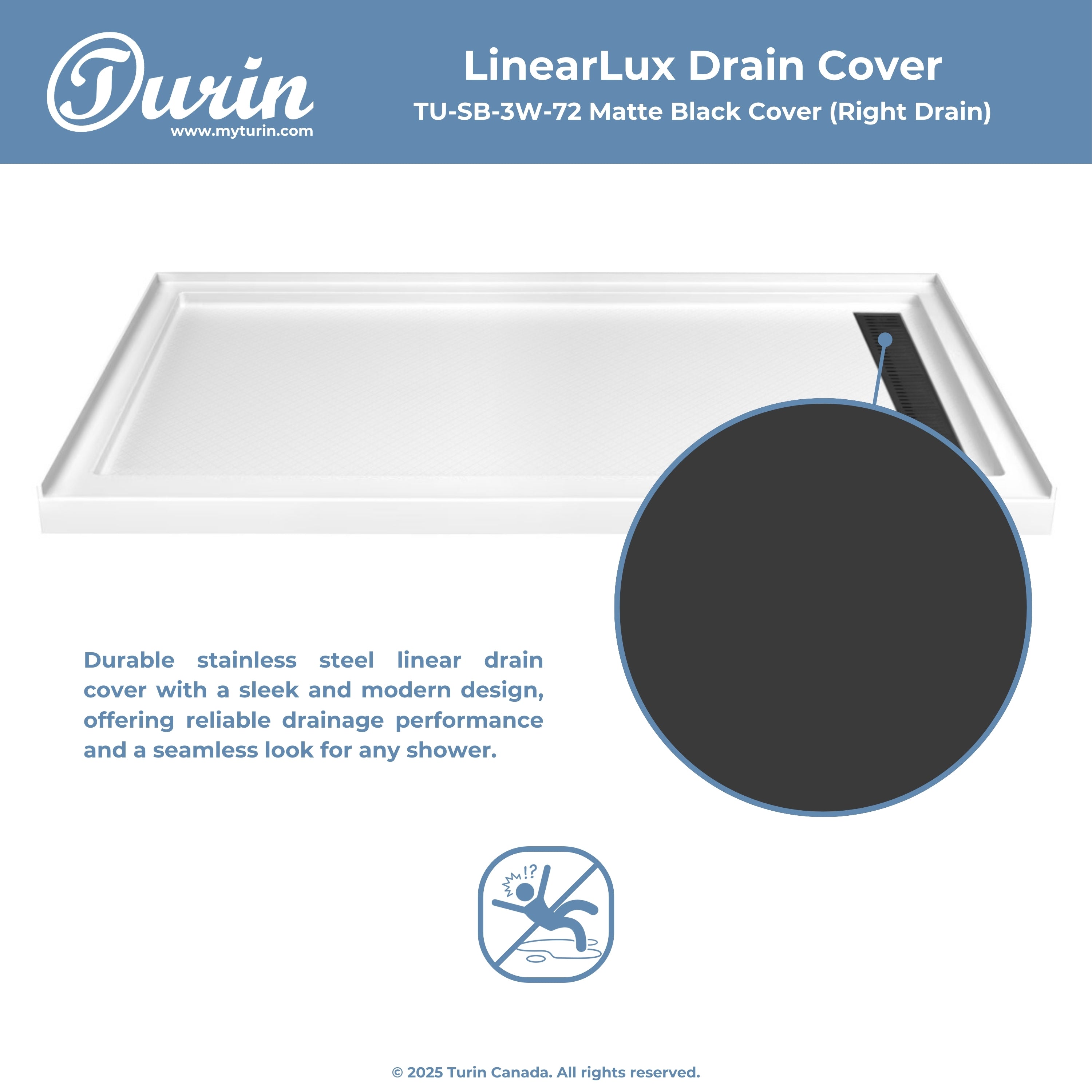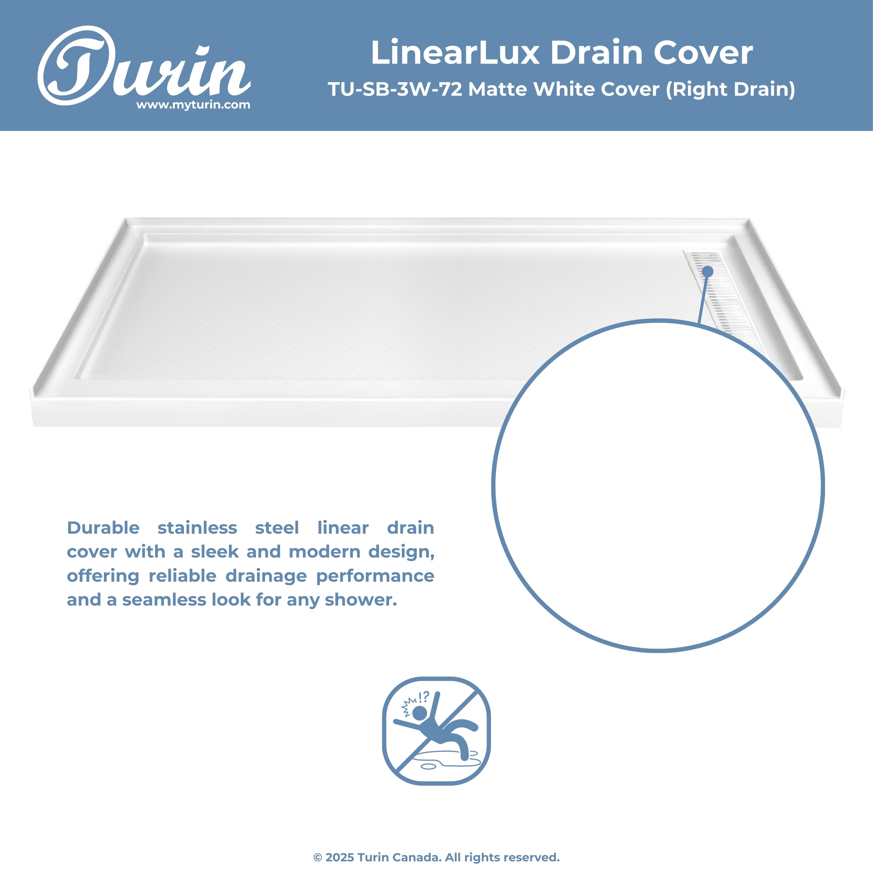 - Couvercle de drain linéaire (72" seulement) : blanc, chrome, nickel, noir, or brossé, bronze